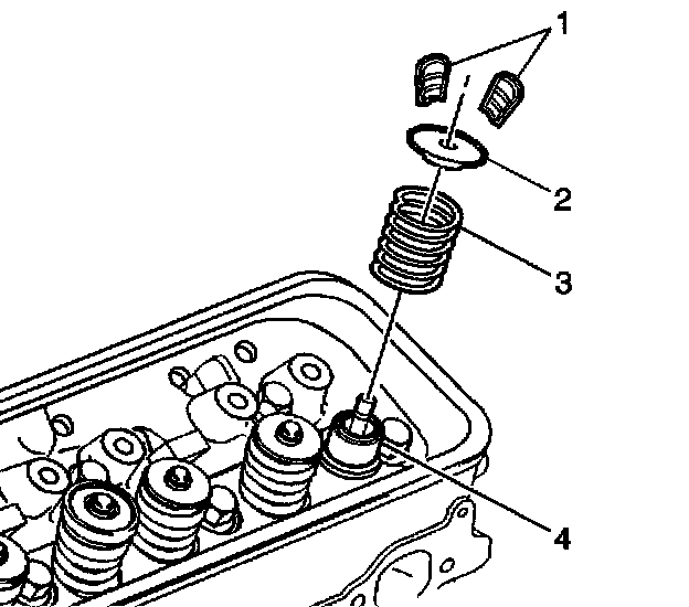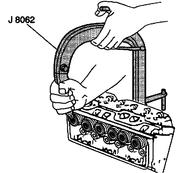 Caution: Compressed valve springs have high tension against the valve spring compressor. Valve springs that are not properly compressed by or released from the valve spring compressor can be ejected from the valve spring compressor with intense force. Use care when compressing or releasing the valve spring with the valve spring compressor and when removing or installing the valve stem keys. Failing to use care may cause personal injury.