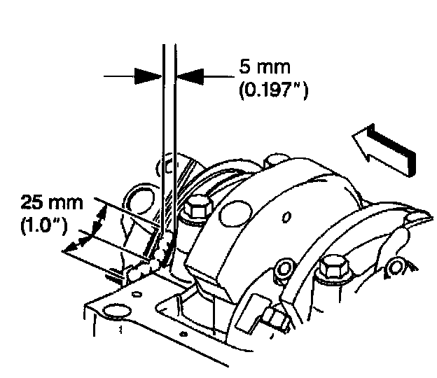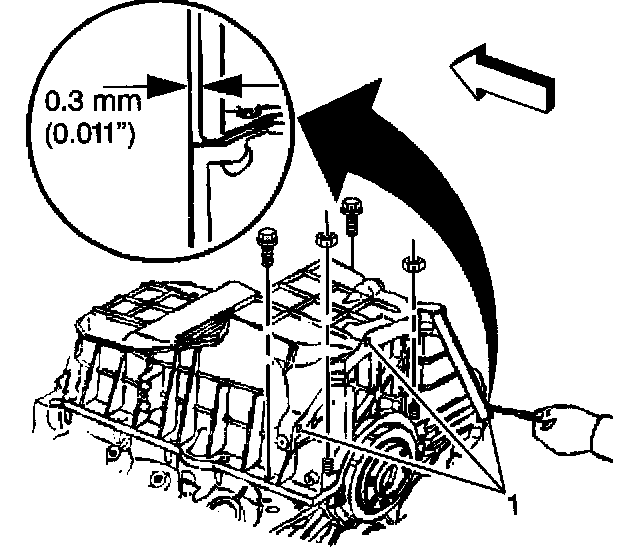Use a feeler gage to check the clearance between the oil pan-to-transmission housing measurement points. If the clearance exceeds 0.3 mm (0.011 inch) at any of the 3 oil pan-to-transmission housing measurement points (1), then repeat the step until the oil pan-to-transmission housing clearance is within the specification. The oil pan must always be forward of the rear face of the engine block.