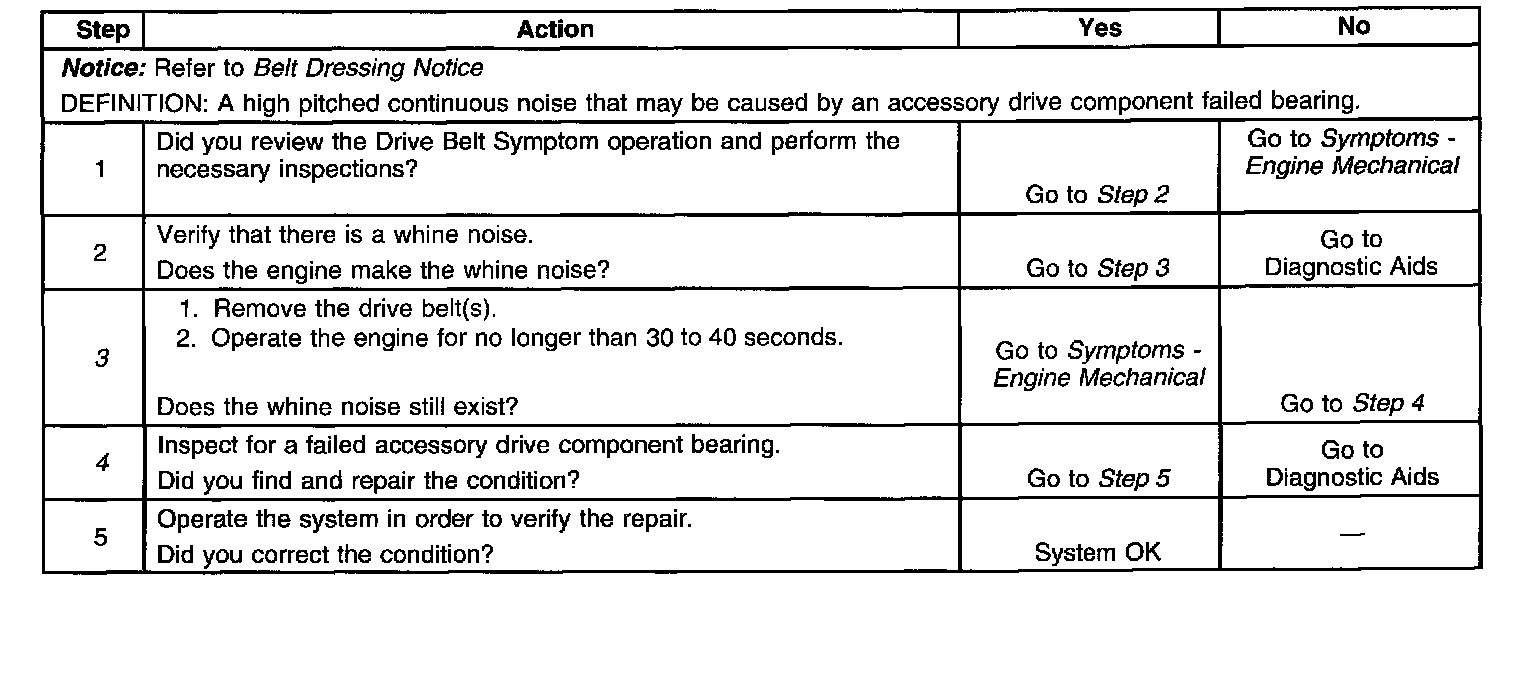 4. The inspection should include checking the drive belt tensioner and the drive belt idler pulley bearings. The drive belt(s) may have to be Installed and the accessory drive components operated separately by varying their loads. Refer to the suspected accessory drive component for the proper inspection and replacement procedure.