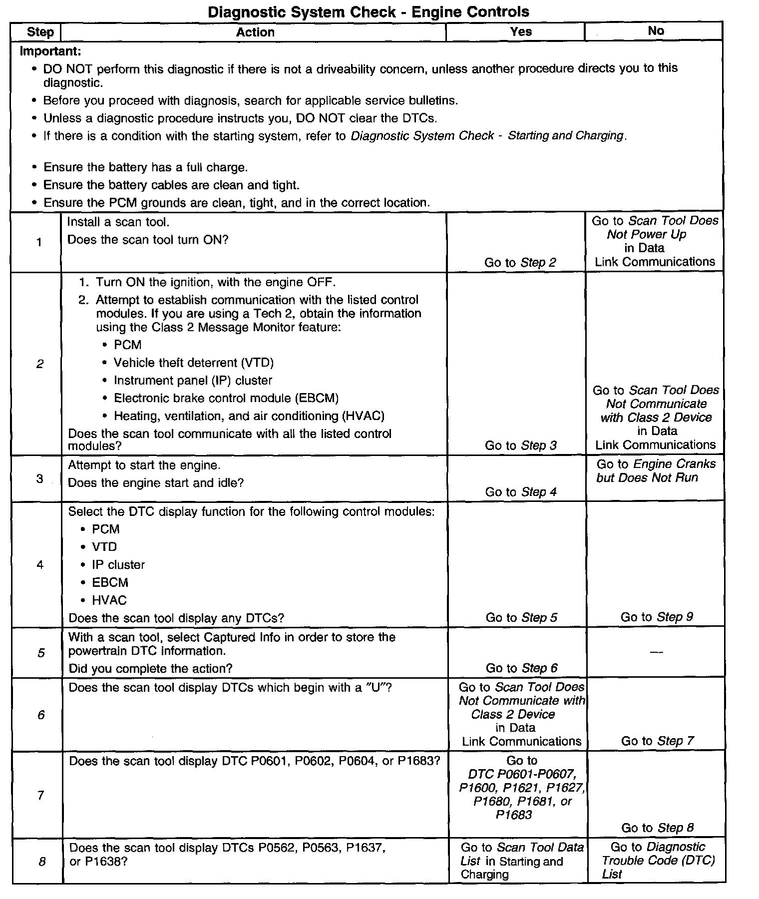 DESCRIPTIONThe Diagnostic System Check-Computers and Controls Systems is an organized approach to identifying a condition that is created by a malfunction in the powertrain control system. The Diagnostic System Check must be the starting point for any driveability concern. The Diagnostic System Check directs the service technician to the next logical step in order to diagnose the concern. Understanding and correctly using the diagnostic table reduces diagnostic time, and prevents the replacement of good parts.