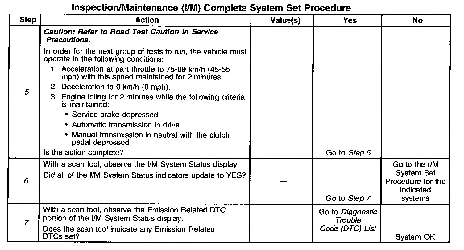 7. The I/M System Status only reports on whether or not a diagnostic has run, not what the outcome of the test was. If any emission related DTC sets after the tests are complete, the DTC will require diagnosis.