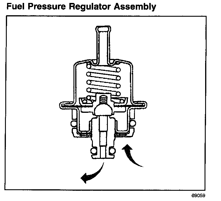 The fuel pressure regulator is a diaphragm relief valve. The diaphragm has fuel pressure on one side and regulator spring pressure and intake manifold vacuum on the other side. The fuel pressure regulator maintains a constant pressure differential across the fuel injectors under all operating conditions.