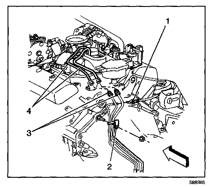 4. Loosen the fuel and evaporative emissions (EVAP) pipe retainer (2) nut at the bellhousing stud.