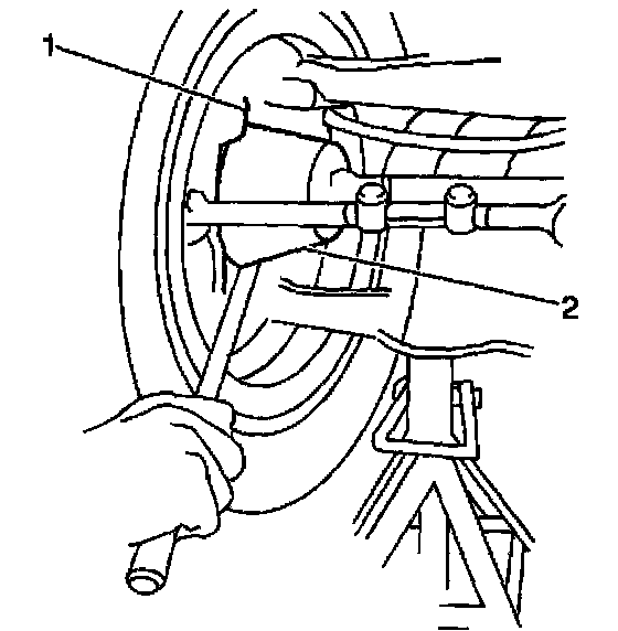 8. Pry between the lower control arm (2) and the outer bearing race (1) while reading the dial indicator. This shows vertical looseness in the ball joints. The lower ball joint is not preloaded and may show some looseness.