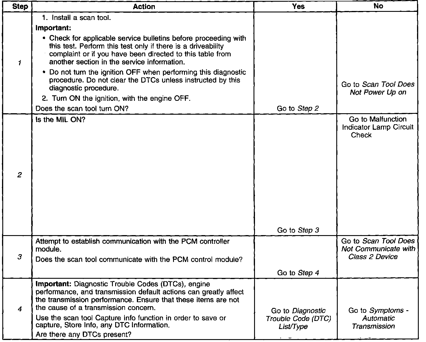 The Automatic Transmission Diagnostic System Check is an organized approach to identify a problem created by an automatic transmission. The Diagnostic System check is the diagnostic starting point for an automatic transmission complaint. The Diagnostic System Check directs you to the next logical step for diagnosing a transmission concern. Perform this check only if there is a driveability complaint or if you have been directed here from another service information.