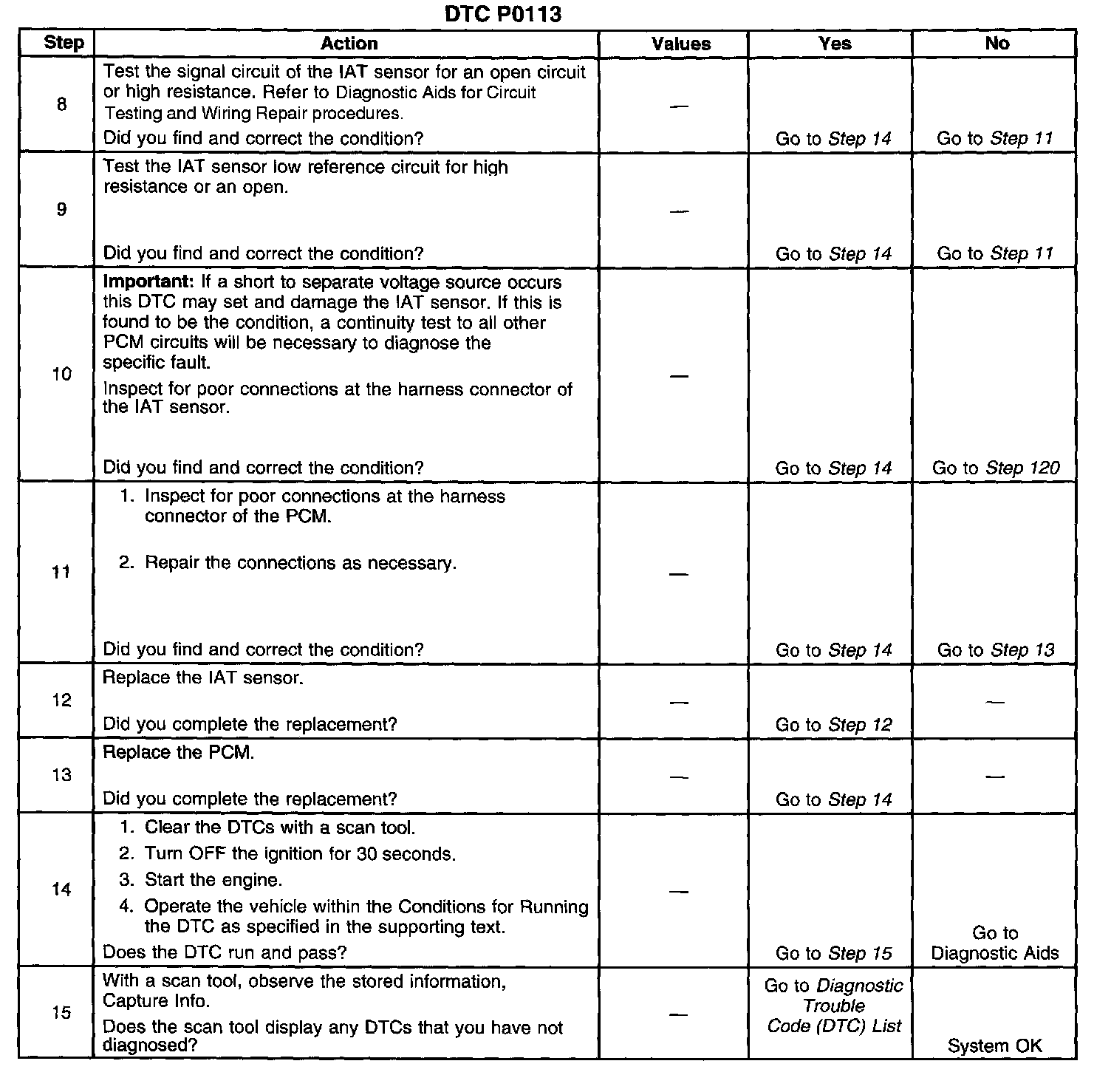 CIRCUIT DESCRIPTIONThe intake air temperature (IAT) sensor is a variable resistor, sometimes called a thermistor. The IAT sensor has a signal circuit and a low reference circuit. The IAT sensor measures the temperature of the air entering the engine. The powertrain control module (PCM) supplies 5 volts to the IAT signal circuit. When the IAT sensor is cold, the sensor resistance is high. When the air temperature increases, the sensor resistance lowers. With high sensor resistance, the PCM detects a high voltage on the IAT signal circuit. With lower sensor resistance, the PCM detects a lower voltage on the IAT signal circuit. If the PCM detects an excessively high IAT signal voltage, indicating a low temperature, DTC P0113 sets.