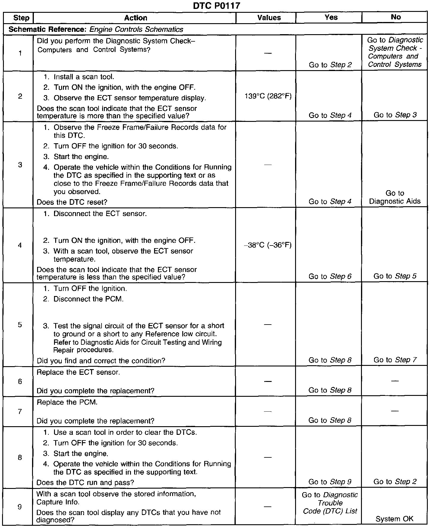3. If DTC P0117 can only be repeated by duplicating the Failure Records, refer to Temperature vs Resistance. The table may be used to test the ECT sensor at various temperatures to evaluate the possibility of a shifted sensor that may be shorted above or below a certain temperature. If this is the case, replace the ECT sensor. If the ECT sensor appears to be OK, the malfunction is intermittent. Refer to Diagnostic Aids.