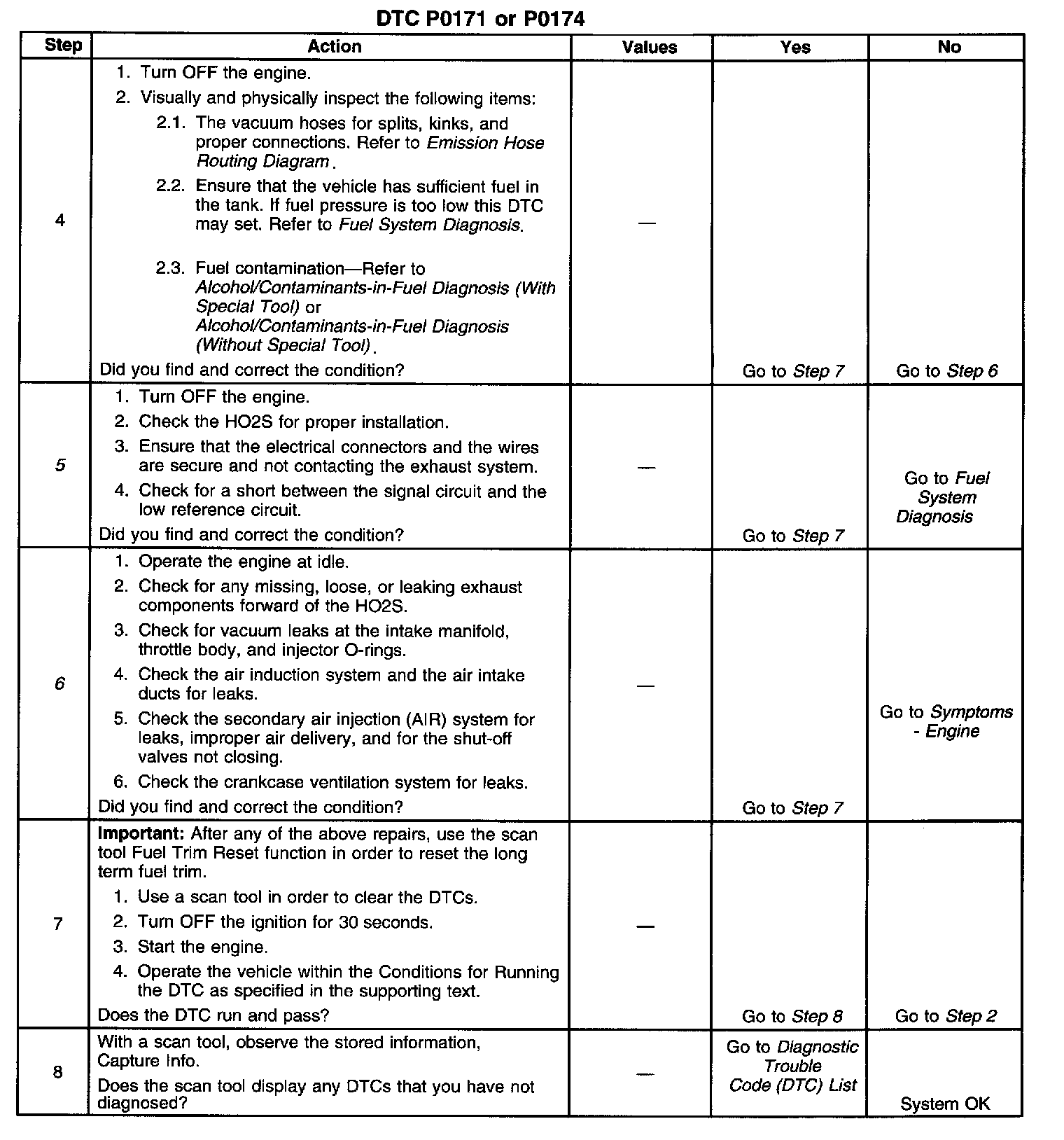 CIRCUIT DESCRIPTIONThe powertrain control module (PCM) controls the air/fuel metering system in order to provide the best possible combination of drive ability, fuel economy, and emission control. Fuel delivery is controlled differently during Open Loop and Closed Loop. During Open Loop, the PCM determines fuel delivery based on sensor signals without oxygen sensor input. During Closed Loop, the oxygen sensor inputs are added and used by the PCM to calculate short and long term fuel trim fuel delivery adjustments. If the oxygen sensors indicate a lean condition, fuel trim values will be above 0 percent. If the oxygen sensors indicate a rich condition, fuel trim values will be below 0 percent. Short term fuel trim values change rapidly in response to the heated oxygen sensor (HO2S) voltage signals. Long term fuel trim makes coarse adjustments in order to maintain an air/fuel ratio of 14.7:1. If the PCM detects an excessively lean condition, this diagnostic trouble code (DTC) will set.