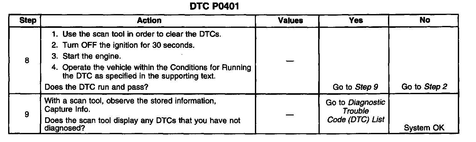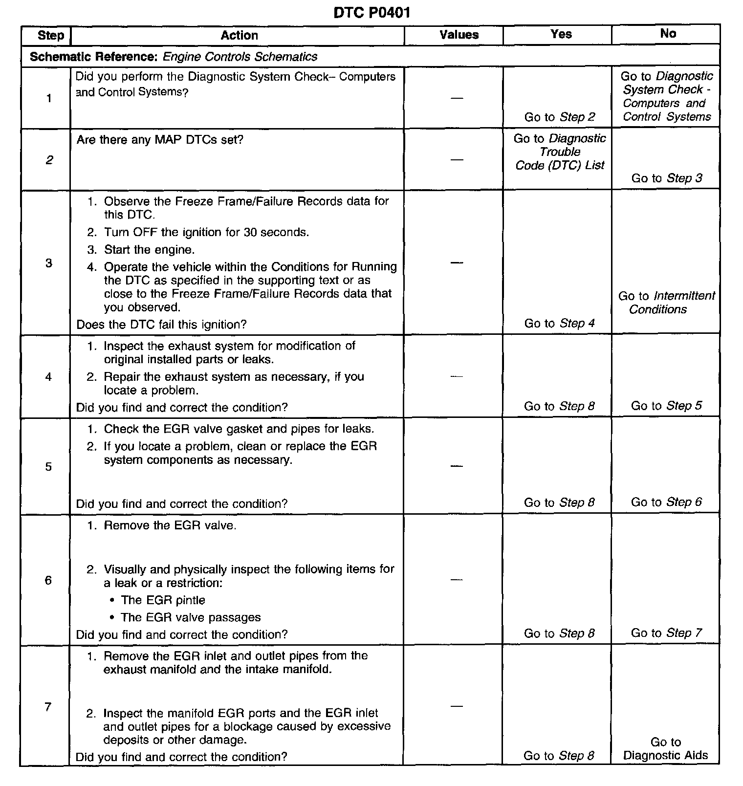 CIRCUIT DESCRIPTIONThe powertrain control module (PCM) tests the exhaust gas recirculation (EGR) system during deceleration by momentarily commanding the EGR valve open. The pressure in the intake manifold increases when the EGR valve is open. The PCM monitors the manifold absolute pressure (MAP) sensor signal during the EGR system diagnostic in order to determine the amount of EGR flow. The PCM calculates an error based on the difference between the actual MAP increase and a predetermined value. The PCM records the error and adjusts an internal fail counter towards the fail threshold it the error is too great. The PCM sets a DTC P0401 when the fail counter exceeds the fail threshold. The number of test samples required to exceed the fail threshold varies according to the magnitude of the detected flow errors. The PCM allows only one EGR flow test sample to be taken during an ignition cycle.
