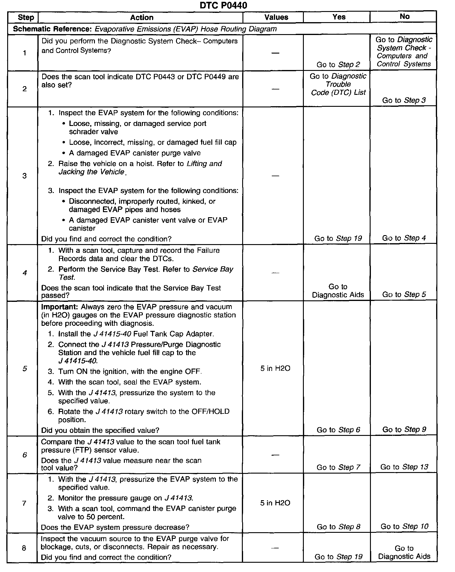 DESCRIPTIONThe EVAP LARGE LEAK TEST applies vacuum to the evaporative emission (EVAP) system and monitors vacuum decay. The control module uses the input from the fuel tank pressure (FTP) sensor in order to determine the rate of vacuum decay. At an appropriate time, the control module turns the EVAP canister purge valve ON (open) and the EVAP canister vent valve ON (closed). This allows the engine to draw a vacuum on the system. At a calibrated time or vacuum level, the control module turns the purge valve OFF (closed), and tests the system vacuum. If the system is unable to achieve the calibrated vacuum control module, DTC P0440 will set.