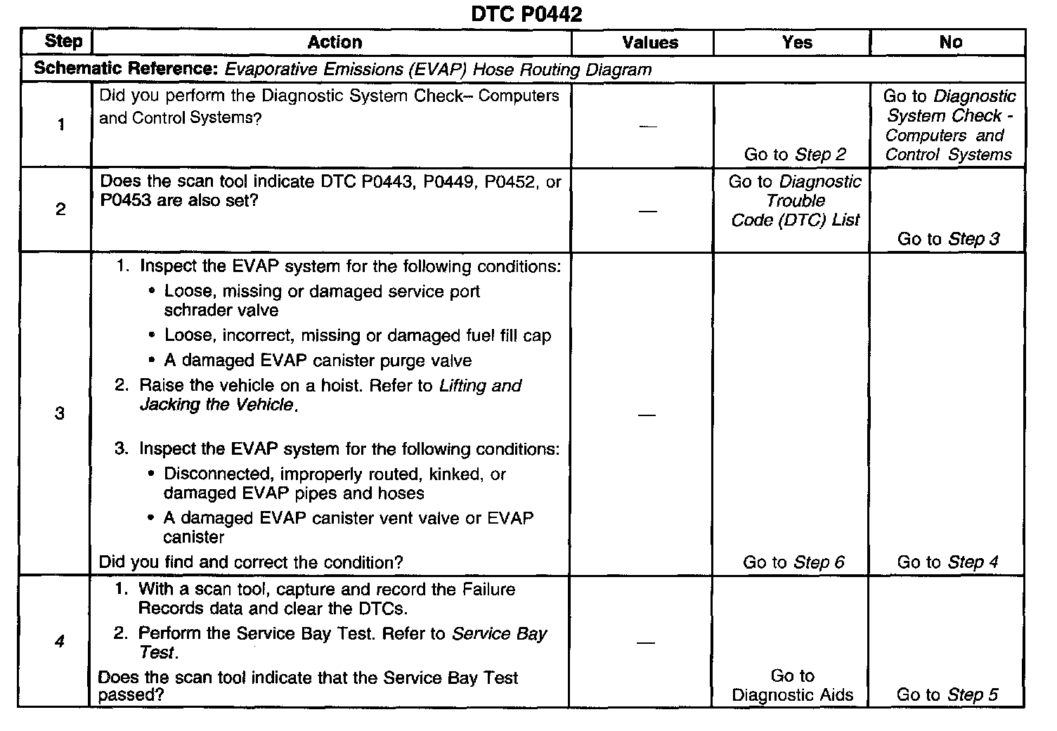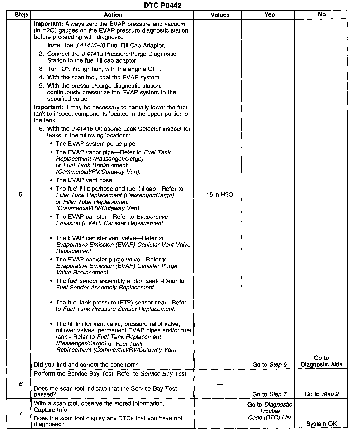 DESCRIPTIONThe evaporative emission (EVAP) small leak test applies vacuum to the EVAP system and monitors vacuum decay. The control module monitors the fuel tank pressure (FTP) sensor signal to determine the vacuum decay rate. At an appropriate time, the control module turns the EVAP canister purge valve ON (open) and the EVAP vent valve ON (closed). This allows the engine to draw a vacuum on the EVAP system. At a calibrated time, or vacuum level, the control module turns the purge valve OFF (closed), sealing the system, and monitors the FTP sensor input in order to determine EVAP system vacuum decay. If the system detects a leak larger than a calibrated amount, DTC P0442 will set.