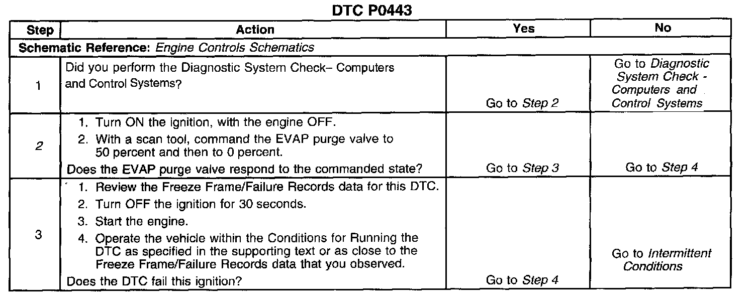 CIRCUIT DESCRIPTIONAn ignition voltage is supplied directly to the evaporative emission (EVAP) purge valve. The EVAP purge valve is pulse width modulated (PWM). The control module controls the EVAP purge valve on time by grounding the control circuit via an internal switch called a driver. The scan tool displays the amount of on time as a percentage. The control module monitors the status of the driver. If the control module detects an incorrect voltage for the commanded state of the driver, DTC P0443 sets.