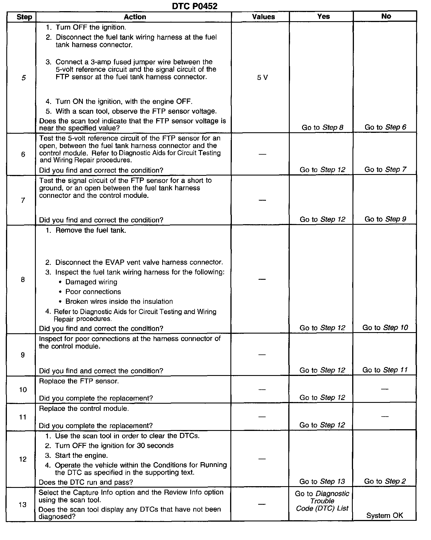 CIRCUIT DESCRIPTIONThe control module monitors the fuel tank pressure (FTP) sensor signal in order to detect vacuum decay and excess vacuum during the enhanced evaporative emission (EVAP) diagnostic. The control module supplies a 5-volt reference and ground to the sensor. The FTP sensor signal voltage increases as the fuel tank pressure decreases (negative pressure or vacuum, high voltage). The FTP sensor signal voltage decreases as the fuel tank pressure increases (positive pressure, low voltage). When the FTP sensor signal goes below a predetermined value, DTC P0452 will set.