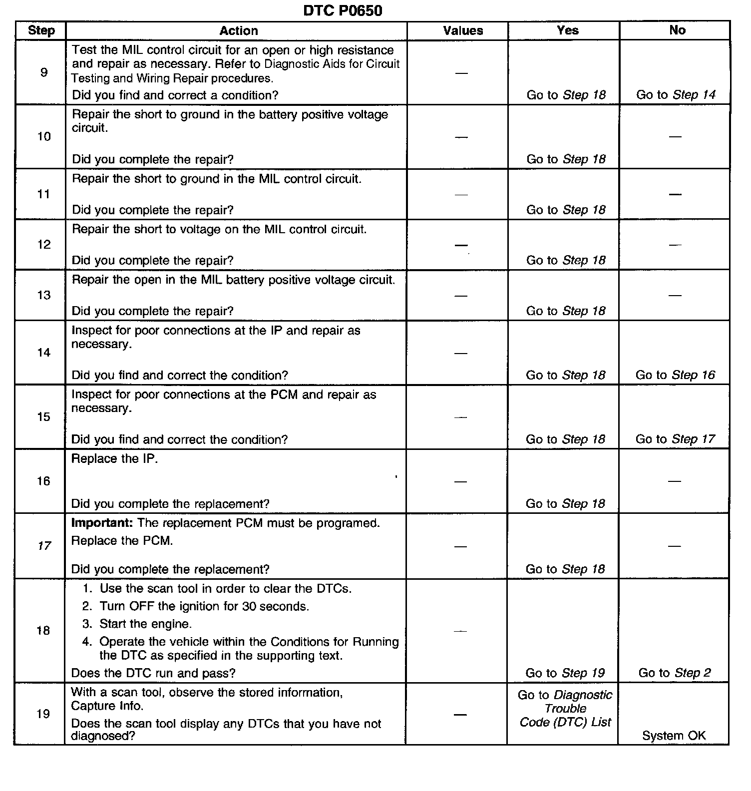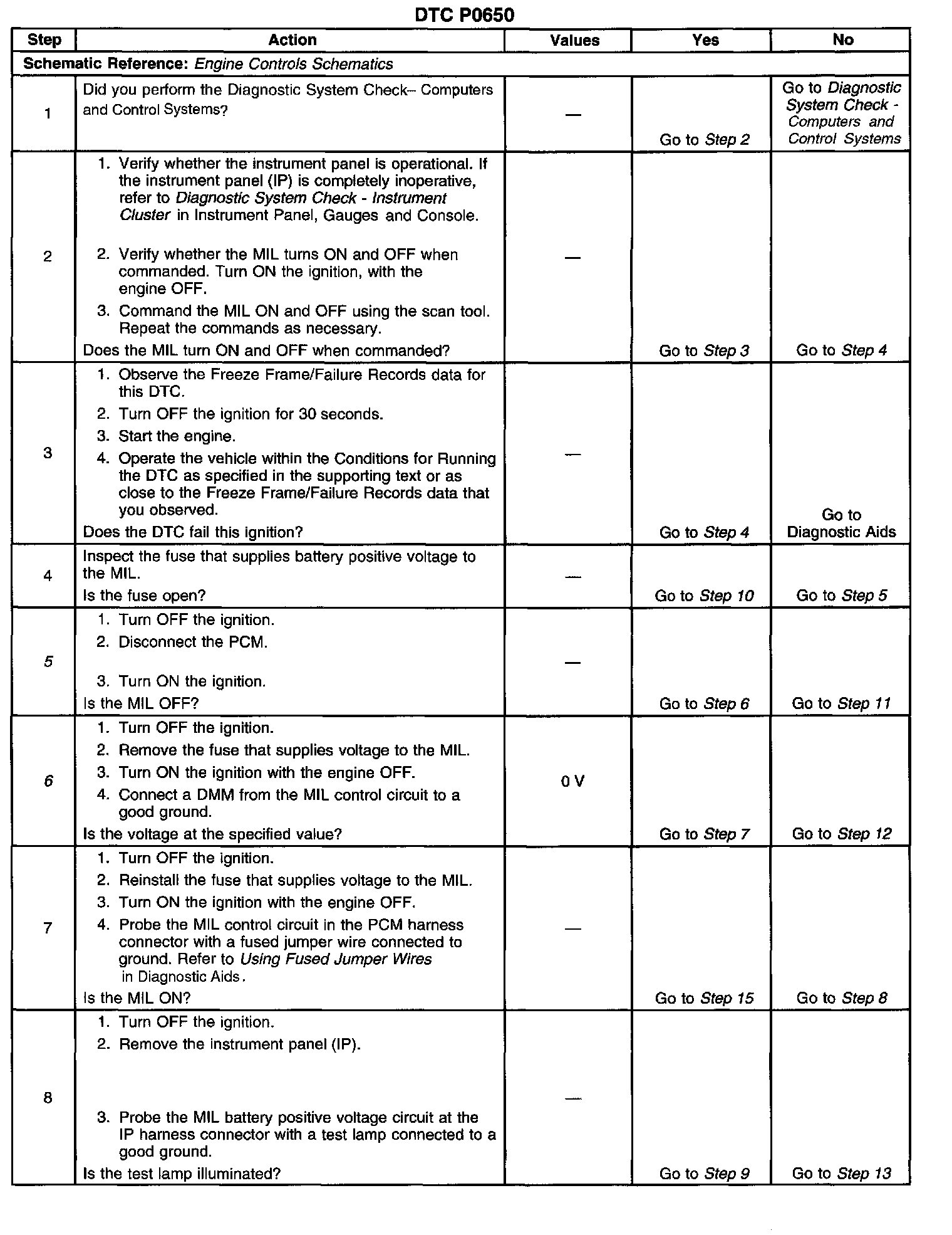 5. This step tests for a short to ground in the MIL control circuit. With the PCM disconnected and the ignition ON the MIL should be OFF.