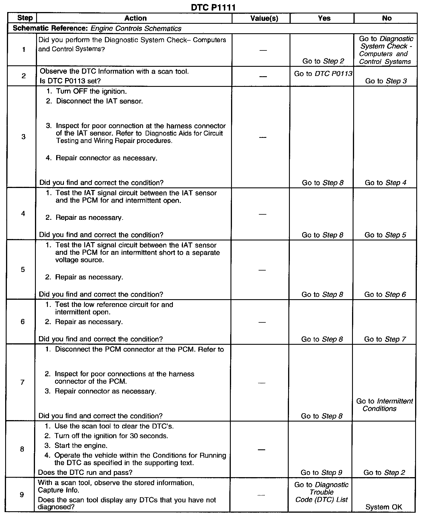 CIRCUIT DESCRIPTIONThe intake air temperature (IAT) sensor is a variable resistor, sometimes called a thermistor. The IAT sensor has a signal circuit and a low reference circuit. The IAT sensor measures the temperature of the air entering the engine. The powertrain control module (PCM) supplies 5 volts to the IAT signal circuit. When the IAT sensor is cold, the sensor resistance is high. When the air temperature increases, the sensor resistance lowers. With high sensor resistance, the PCM detects a high voltage on the IAT signal circuit. With lower sensor resistance, the PCM detects a lower voltage on the IAT signal circuit. If the PCM detects an intermittent high IAT signal voltage, indicating a low temperature, DTC P1111 sets.
