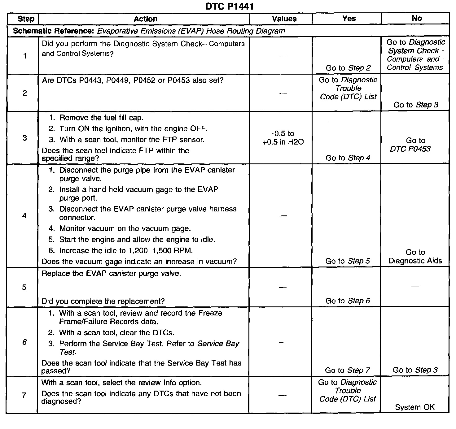 DESCRIPTIONThis diagnostic trouble code (DTC) tests for undesired intake manifold vacuum flow to the evaporative emission (EVAP) system. The powertrain control module (PCM) seals the EVAP system by commanding the EVAP purge valve OFF closed and the EVAP vent valve ON closed. The PCM monitors the fuel tank pressure (FTP) sensor to determine if a vacuum is being drawn on the EVAP system. This DTC will set if the vacuum in the EVAP system is more than a predetermined value within a predetermined time.