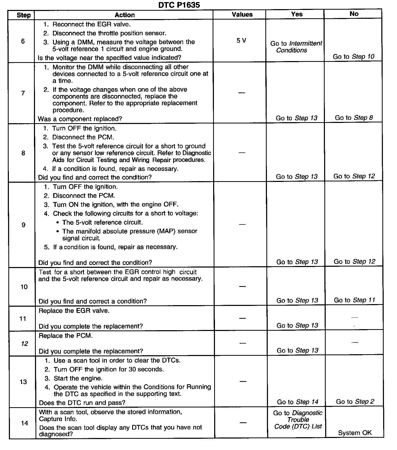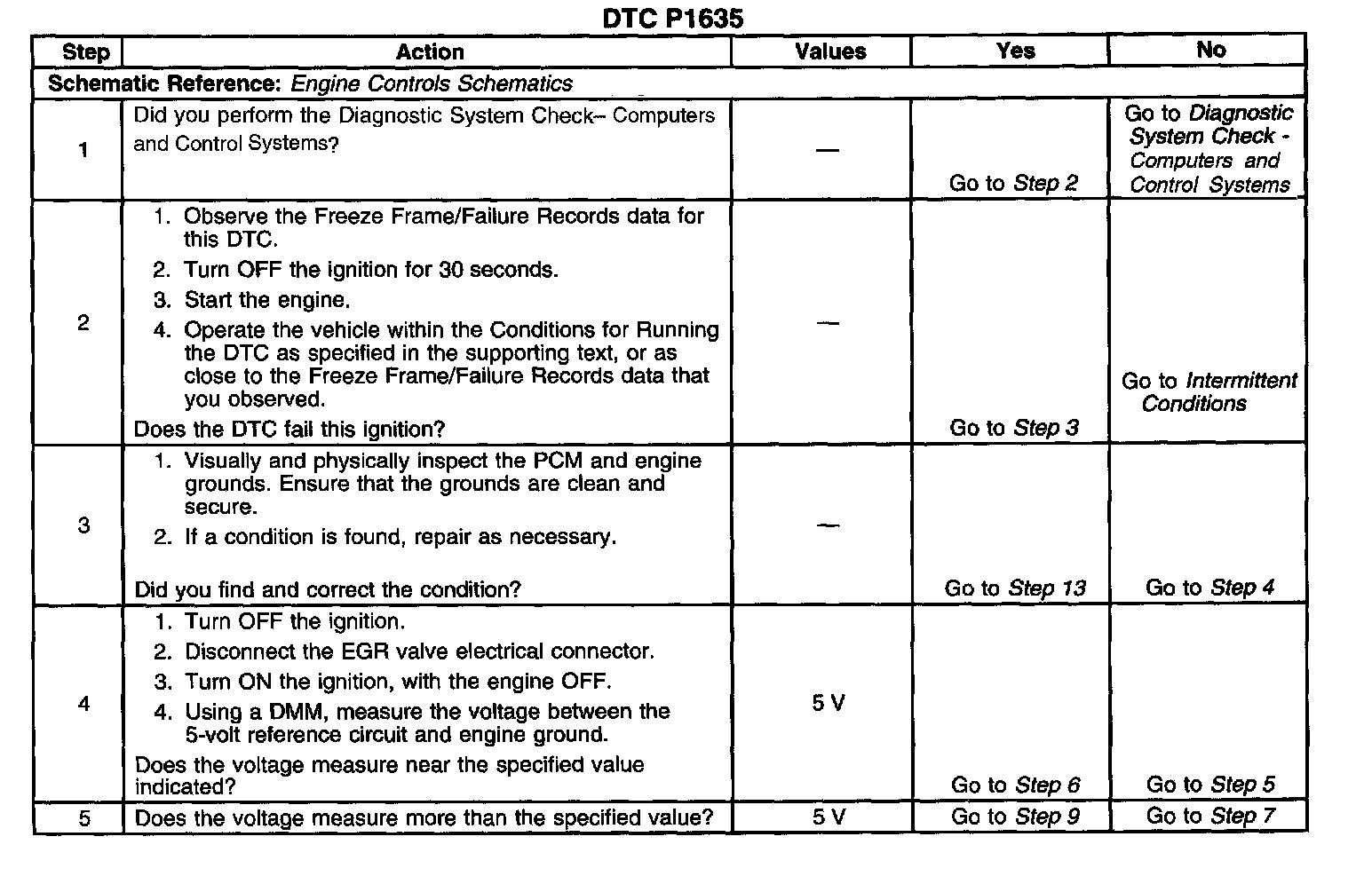 The PCM monitors the voltage on the 5-volt reference 1 circuit. If the voltage is out of tolerance, the PCM will set DTC P1635.