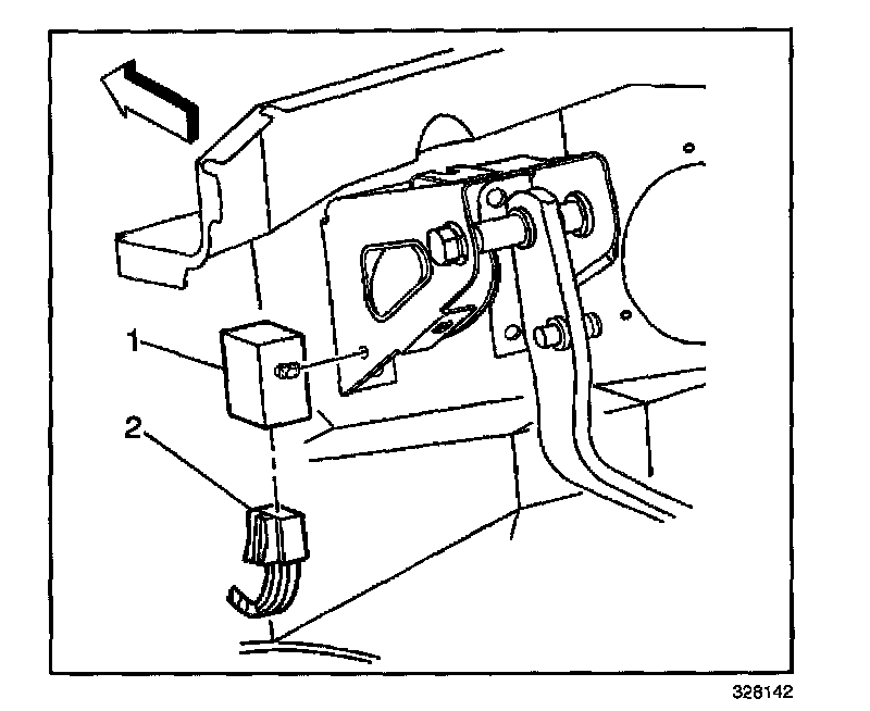 2. Remove the engine coolant level indicator module (1) from the brake pedal support.