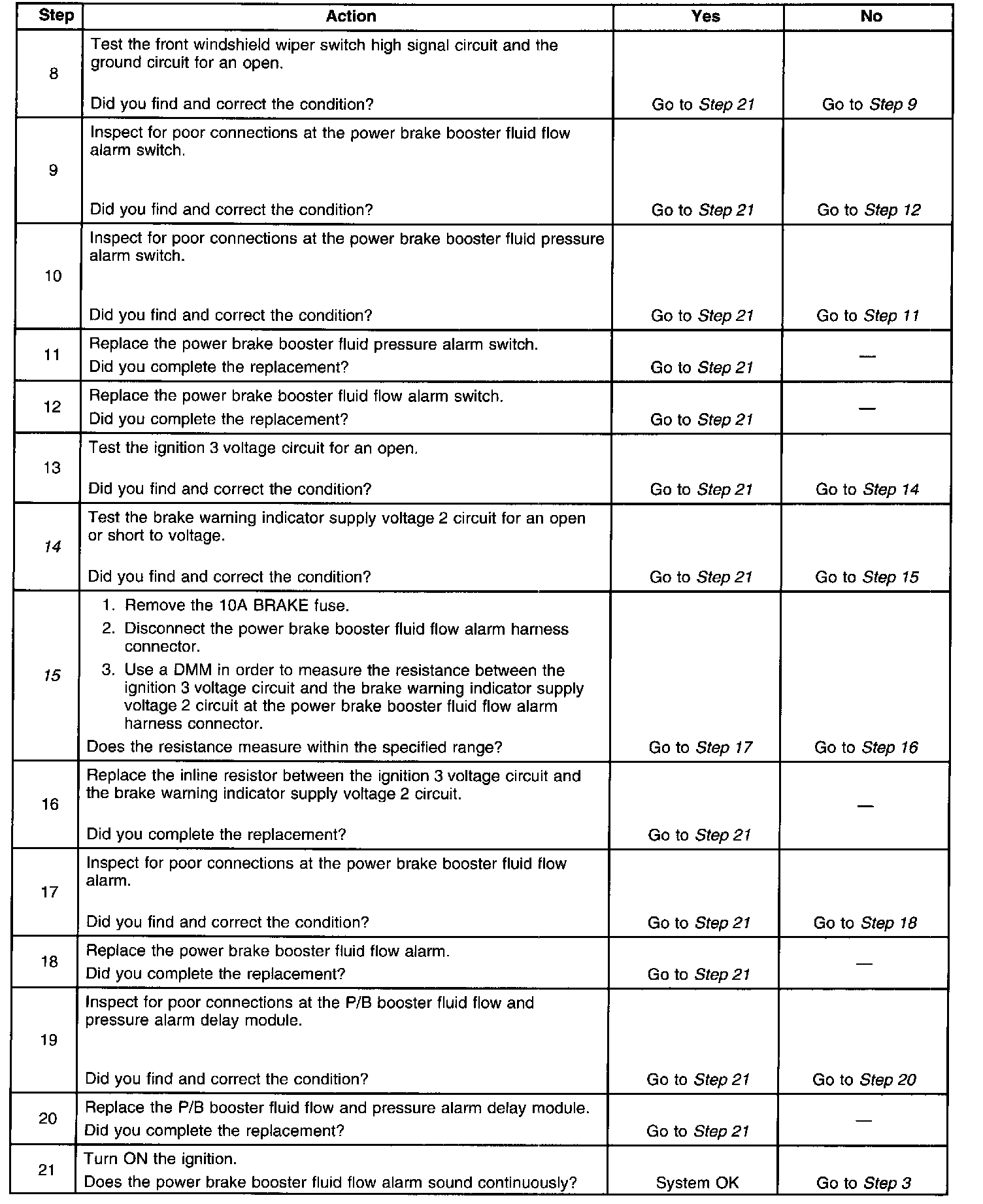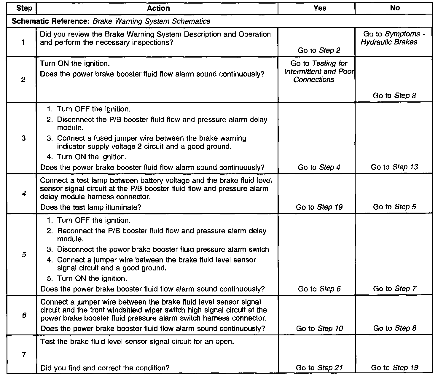 6. This step tests for an open power brake booster fluid pressure alarm switch.