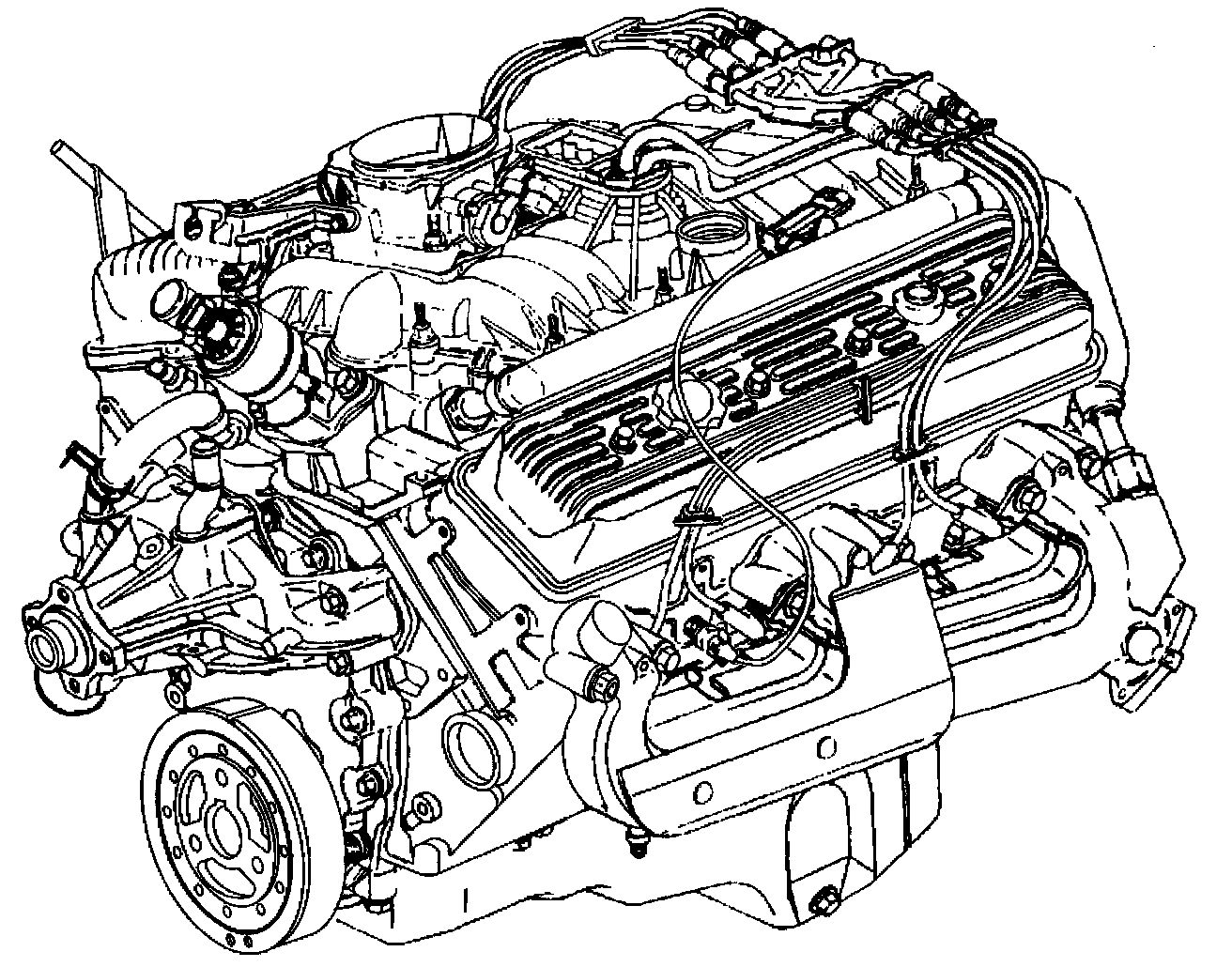 The engine block is made of cast iron and has eight cylinders arranged in a V shape with four cylinders in each bank. The cylinder block is a one piece casting with the cylinders encircled by coolant jackets.