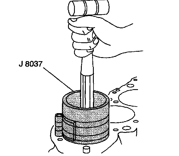 6. Use the J 8037 and the J 5239 and lightly tap the lop of the piston with a wooden hammer handle.