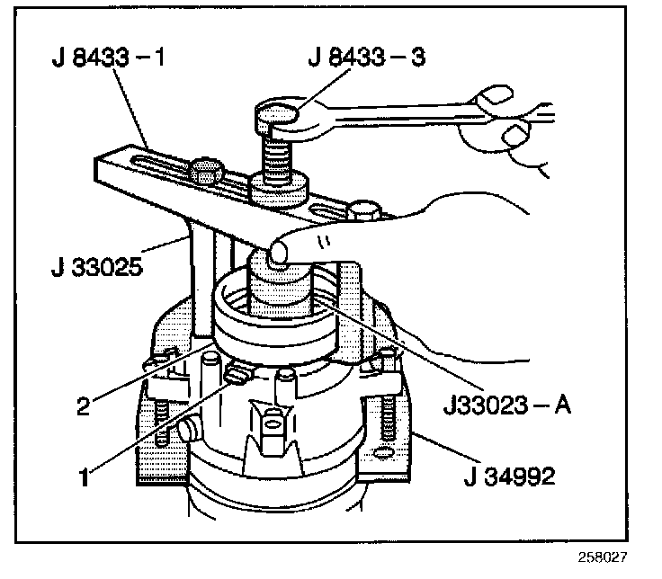 10. Tighten the J 8433-3 against the puller pilot in order to remove the clutch coil (2).