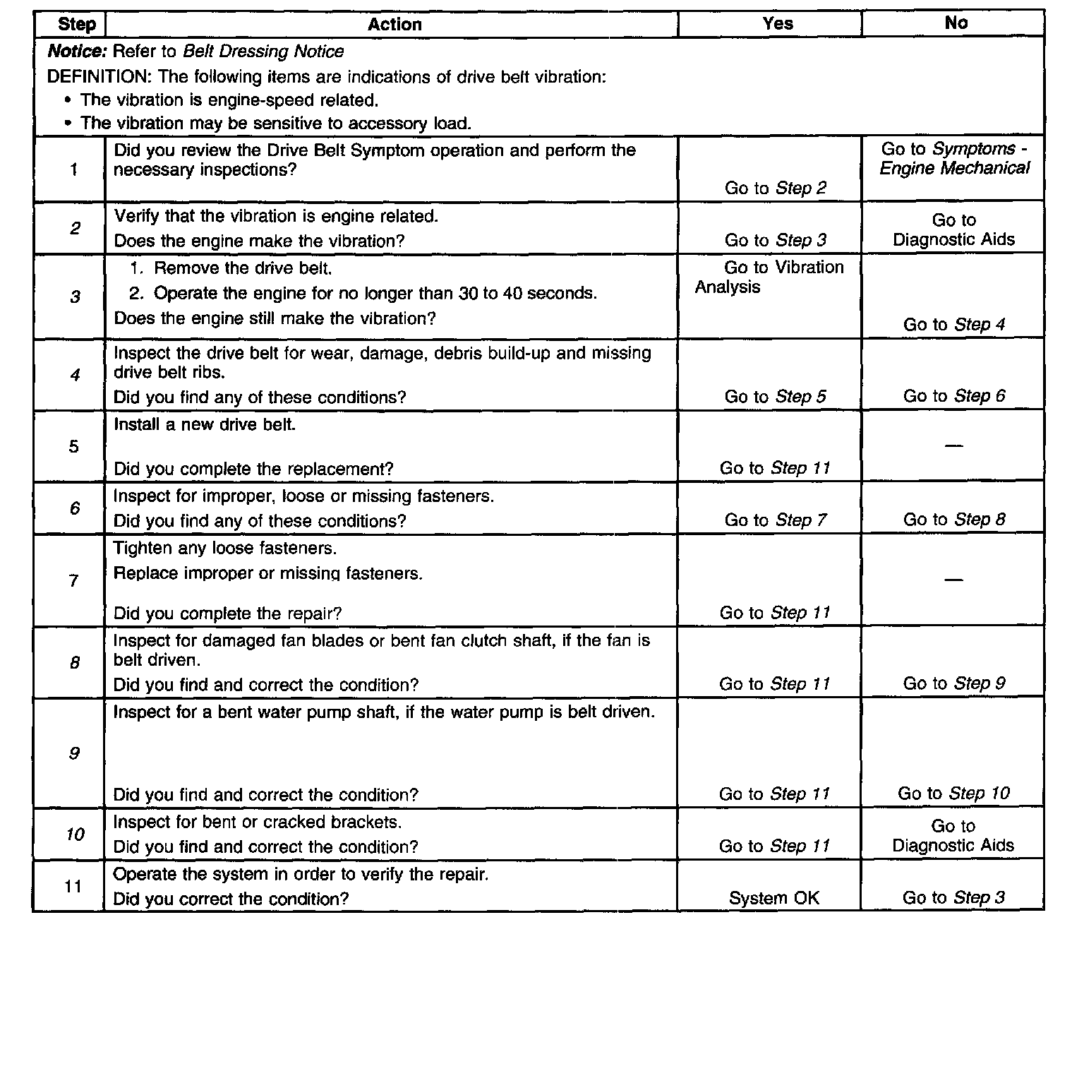 3. This test is to verify that the drive belt(s) or accessory drive components may be causing the vibration. When removing the drive belt the water pump may not be operating and the engine may overheat. Also DTCs may set when the engine is operating with the drive belt removed.