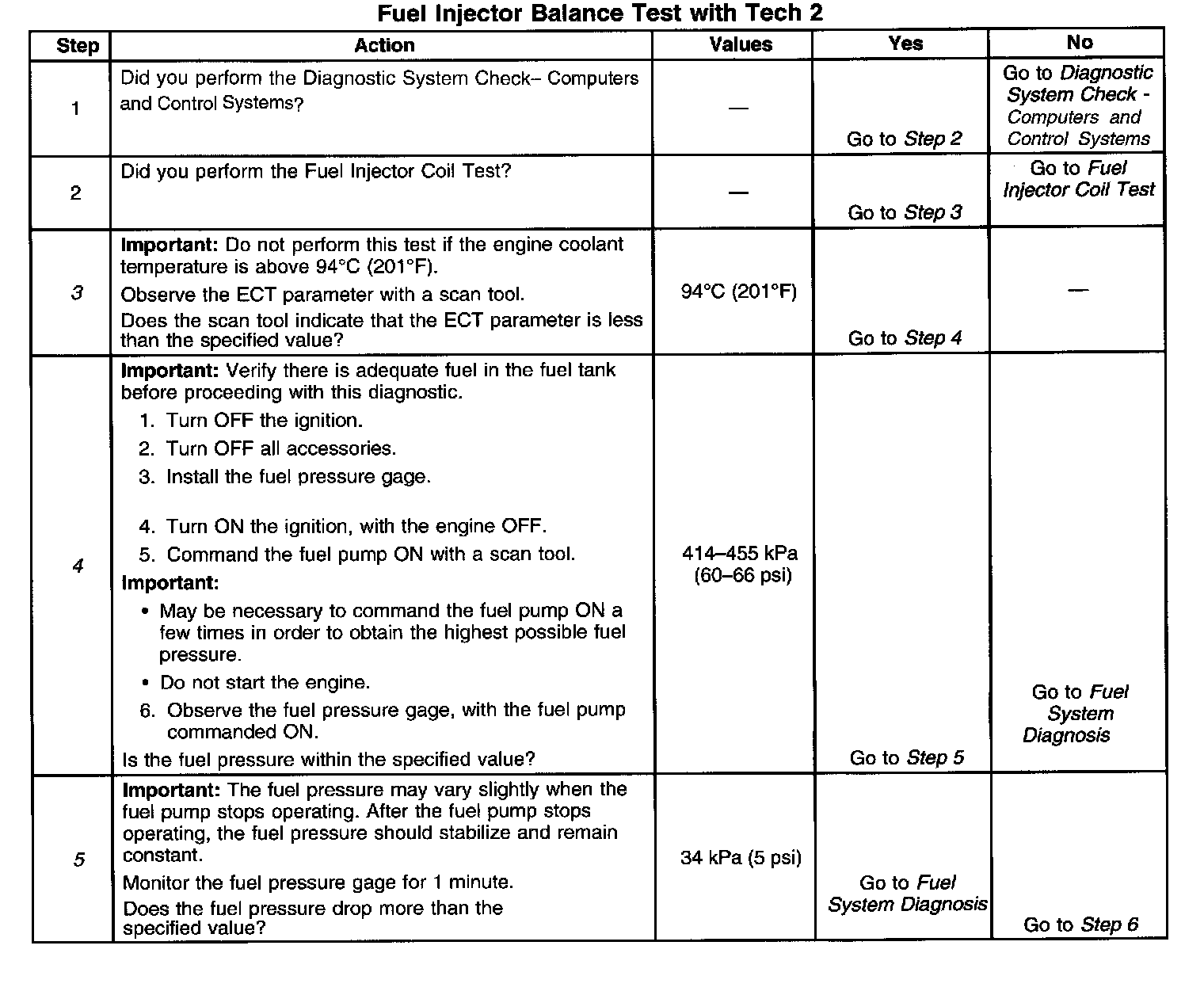6. If the pressure drop value for each fuel injector is within 10 kPa (1.5 psi) of the average pressure drop value, the fuel injectors are flowing properly. Calculate the pressure drop value for each fuel injector by subtracting the second pressure reading from the first pressure reading.