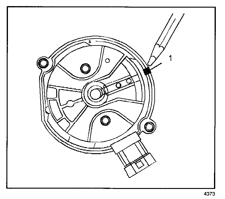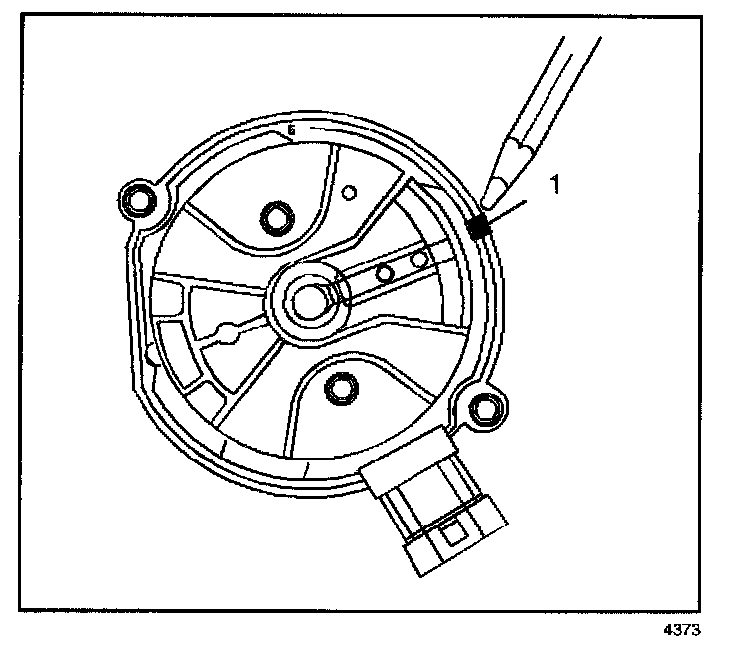 7. Once the distributor is completely seated, the rotor segment should be aligned with the mark on the distributor base (1).