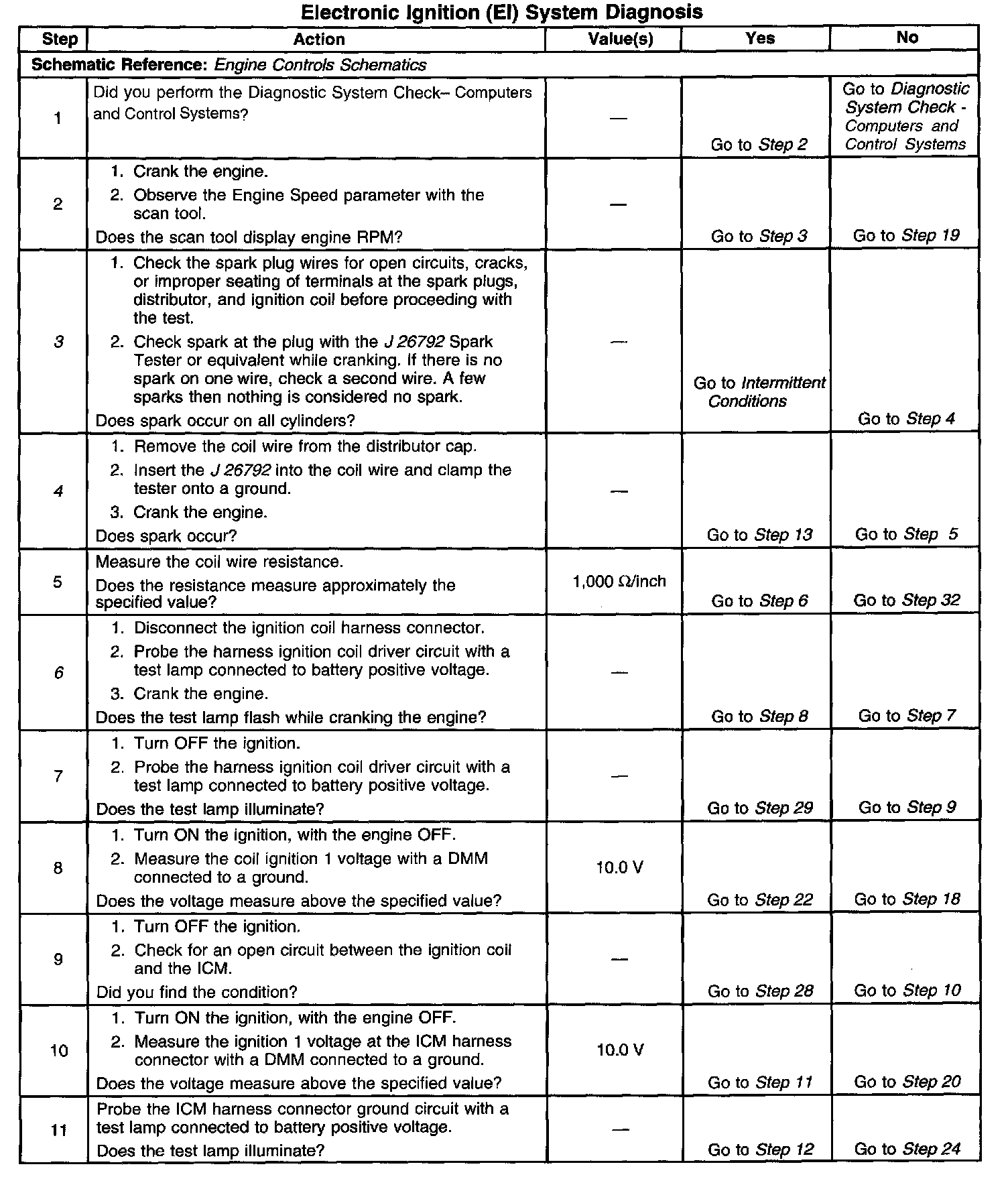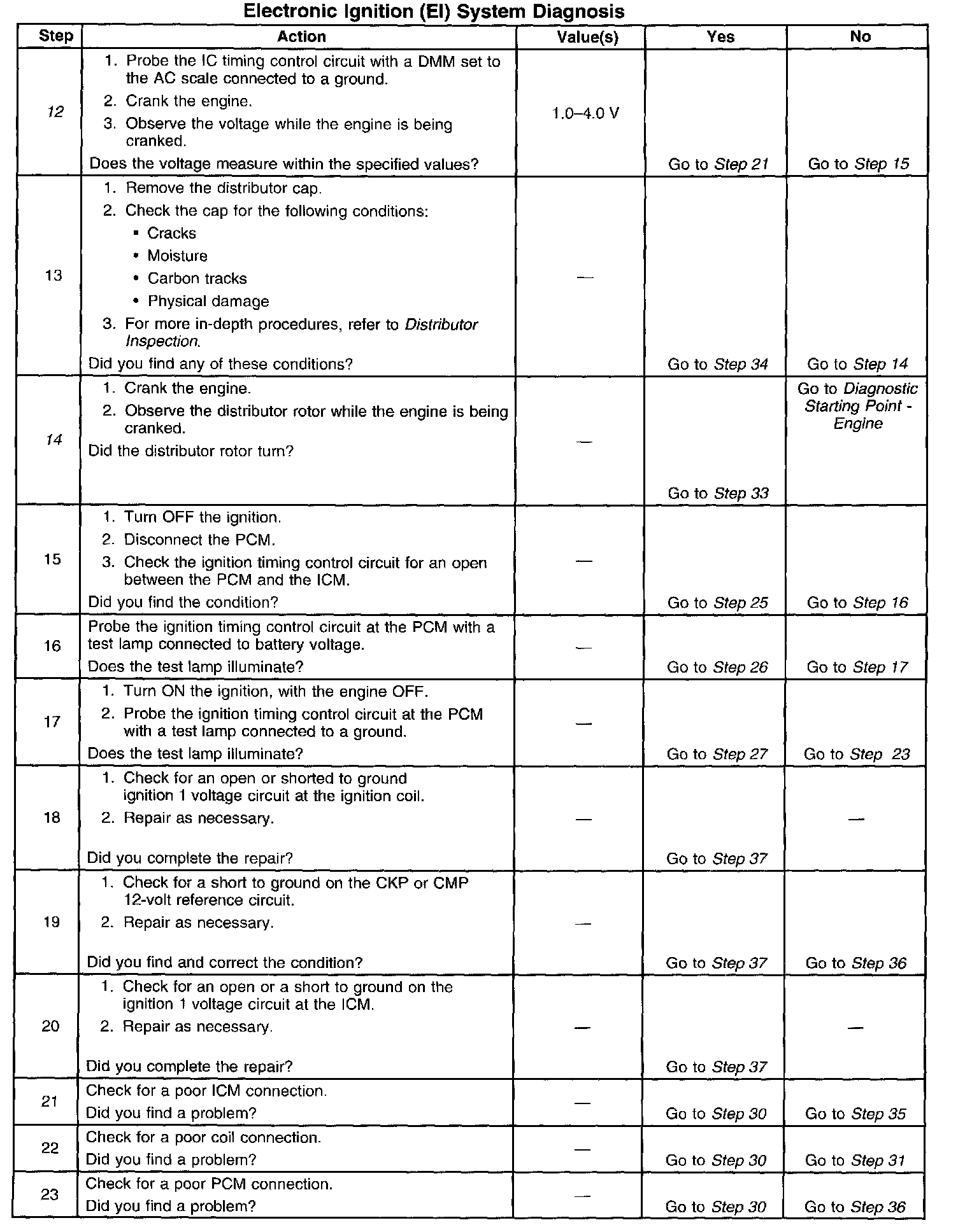 12. This test begins to determine if the PCM is providing a signal to the ICM. If the PCM is not providing a signal to the ignition control module, the problem exists between the ignition control module and the PCM.