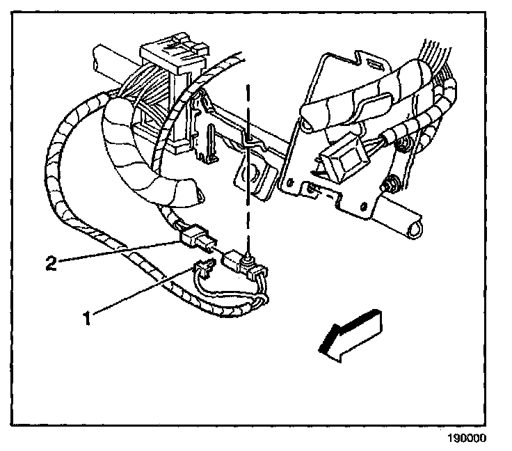5. Disconnect the inflatable restraint steering wheel module connector (2) located next to the steering column.