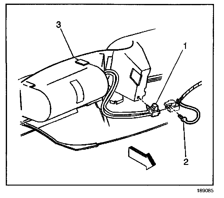 18. Disconnect the inflatable restraint IP module connector (1) located under the instrument panel extension (3).