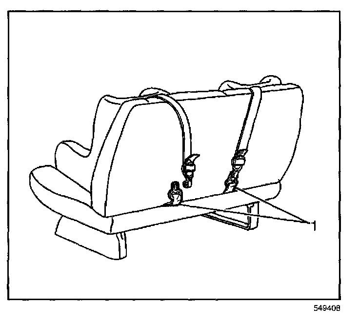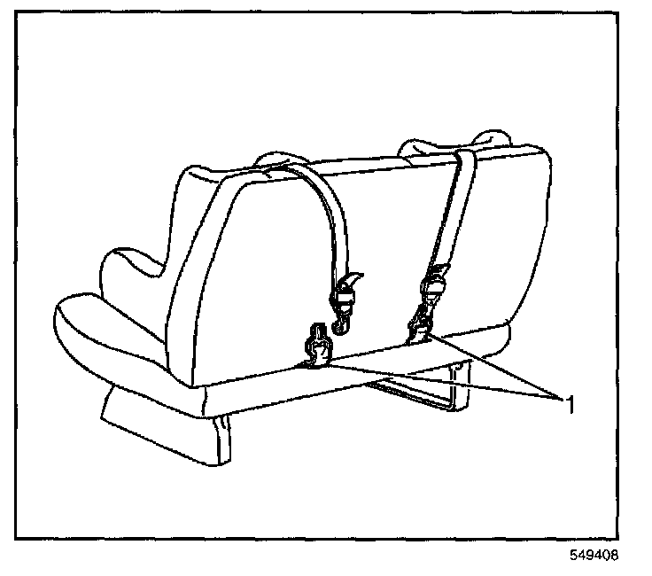 REMOVAL PROCEDURE1. Reach over the back of the bench seat and remove the child seat top tether from the top tether anchor (1).
