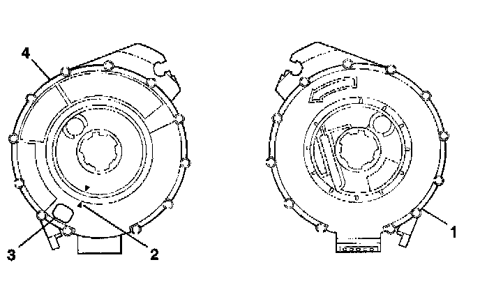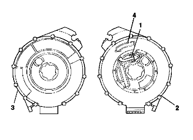 3. If the front (4) of the inflatable restraint steering wheel module coil has a centering window (3) and no spring service lock on the back side (1), perform the following steps: