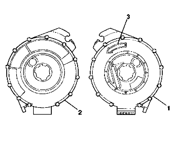4. If no centering window is present on the front side (3) of the inflatable restraint steering wheel module coil, but a spring service lock (1) is on the back side (2), perform the following steps: