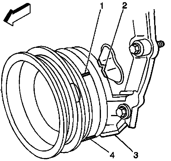Distributor InstallationImportant: The engine front cover has 2 alignment tabs and the crankshaft balancer has 2 alignment marks (spaced 90 degrees apart) which are used for positioning number 1 piston at Top Dead Center (TDC). With the piston on the compression stroke and at top dead center, the crankshaft balancer alignment mark (1) must align with the engine front cover tab (2) and the crankshaft balancer alignment mark (4) must align with the engine front cover tab (3).