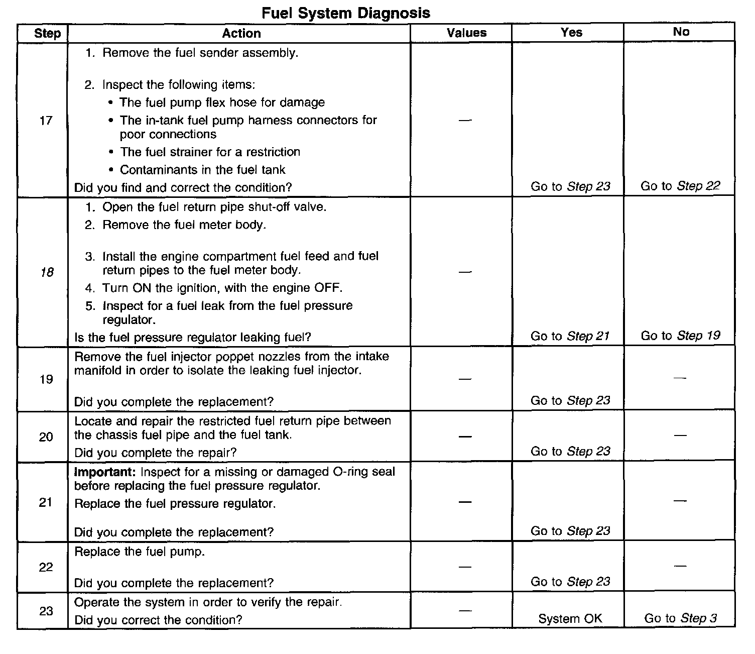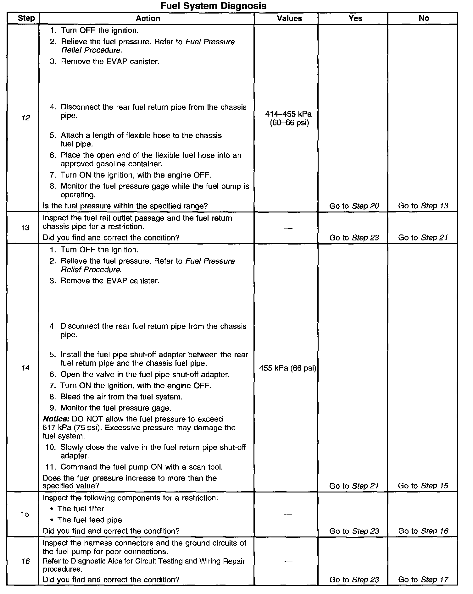 12. This step tests for a restricted fuel return pipe. If the fuel pressure is within the specified values, a restriction in the fuel return pipe is indicated.