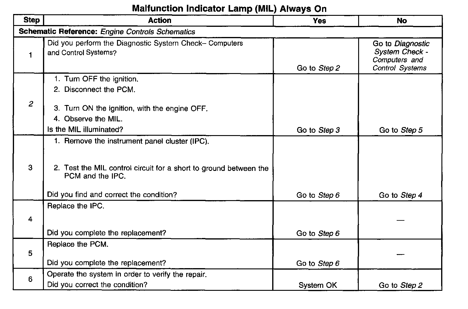 2. This step determines if the condition is with the MIL control circuit or the PCM.