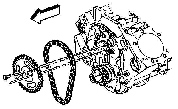 6. Install the camshaft sprocket and the timing chain. The camshaft sprocket alignment mark must be in the 6 o'clock position.