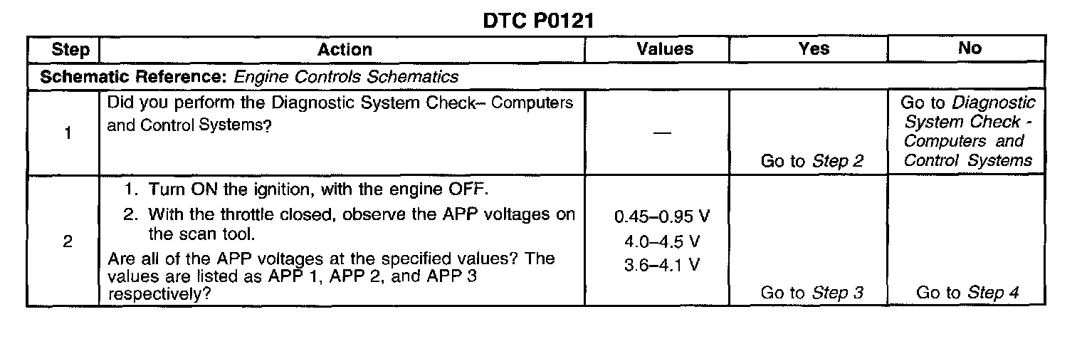A scan tool reads the APP 1 position in volts. The APP 1 position should read approximately 0.45-0.95 volts with the throttle closed and the ignition ON or at idle. The voltage should increase at a steady rate as the throttle is moved toward wide open throttle (WOT). Also, 90 percent pedal travel is acceptable for correct APP operation. Scan the APP 1 sensor while depressing the accelerator pedal with the engine stopped and the ignition ON. The display should vary from approximately 0.74 volts when the throttle was closed to more than 3.7 volts when the throttle is held at WOT position. The following chart will check the voltages on all the APP circuits to see if the voltages are in normal ranges. The PCM compares pre-scaled voltages, which are voltages that the scan tool cannot read. The scan tool reads only output voltages.