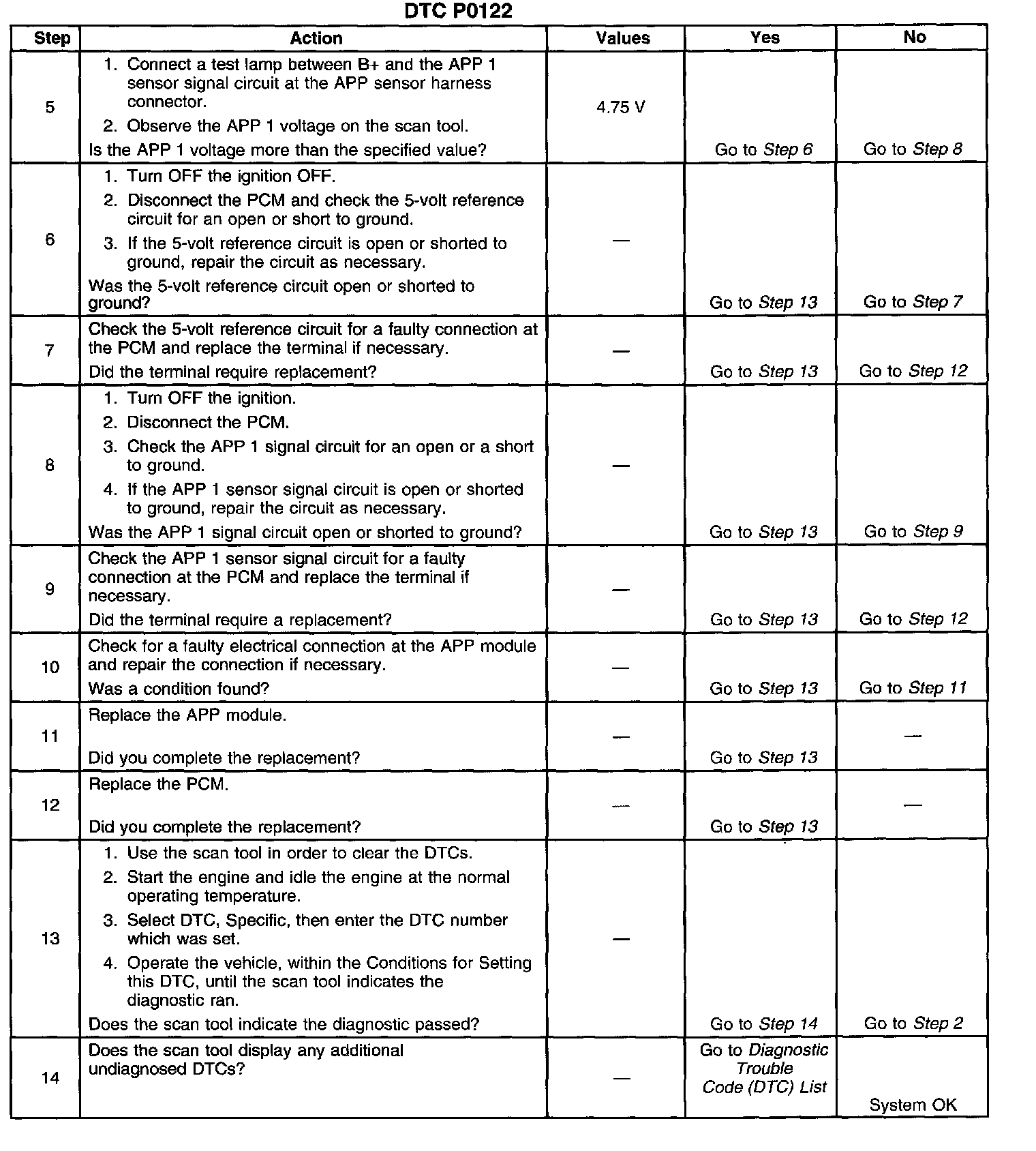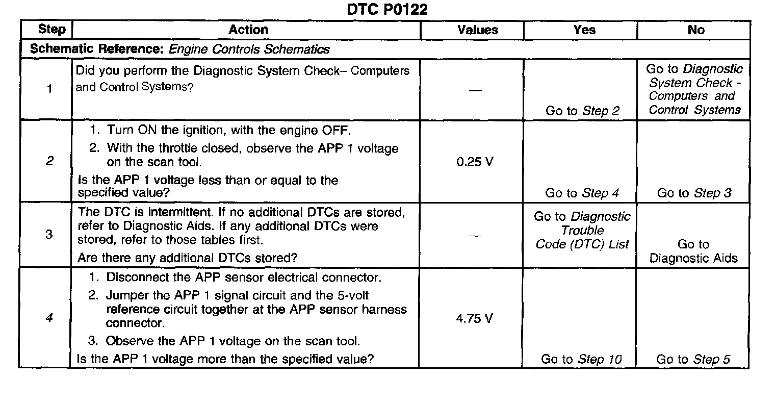 There are no driveability issues associated with the APP module unless a DTC is present. The most likely cause of this DTC are faulty connections or the sensor itself. The least likely cause of this DTC is a powertrain control module (PCM) condition. A scan tool reads APP 1 position in volts. The APP 1 position should read approximately 0.45-0.95 volt with the throttle closed and the ignition ON or at idle. The voltage should increase at a steady rate as the throttle is moved toward wide open throttle (WOT). Also, 90 percent pedal travel is acceptable for correct APP operation. Scan the APP sensor while depressing the accelerator pedal with the engine stopped and the ignition ON. The display should vary from approximately 0.74 volt when the throttle is closed to approximately 3.7 volts when throttle is held at the WOT position. A DTC P0122 will result if the signal or the reference circuits are open.