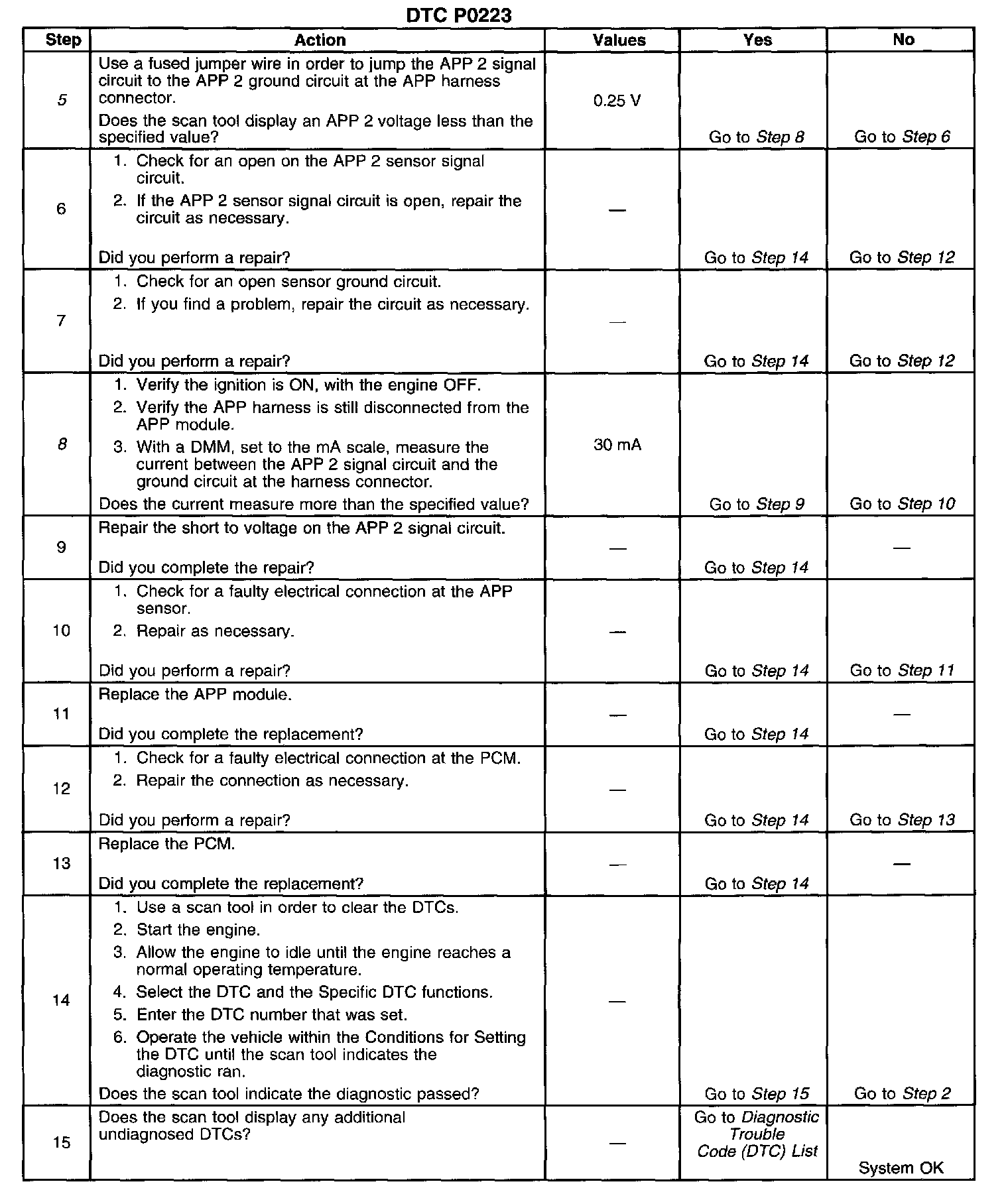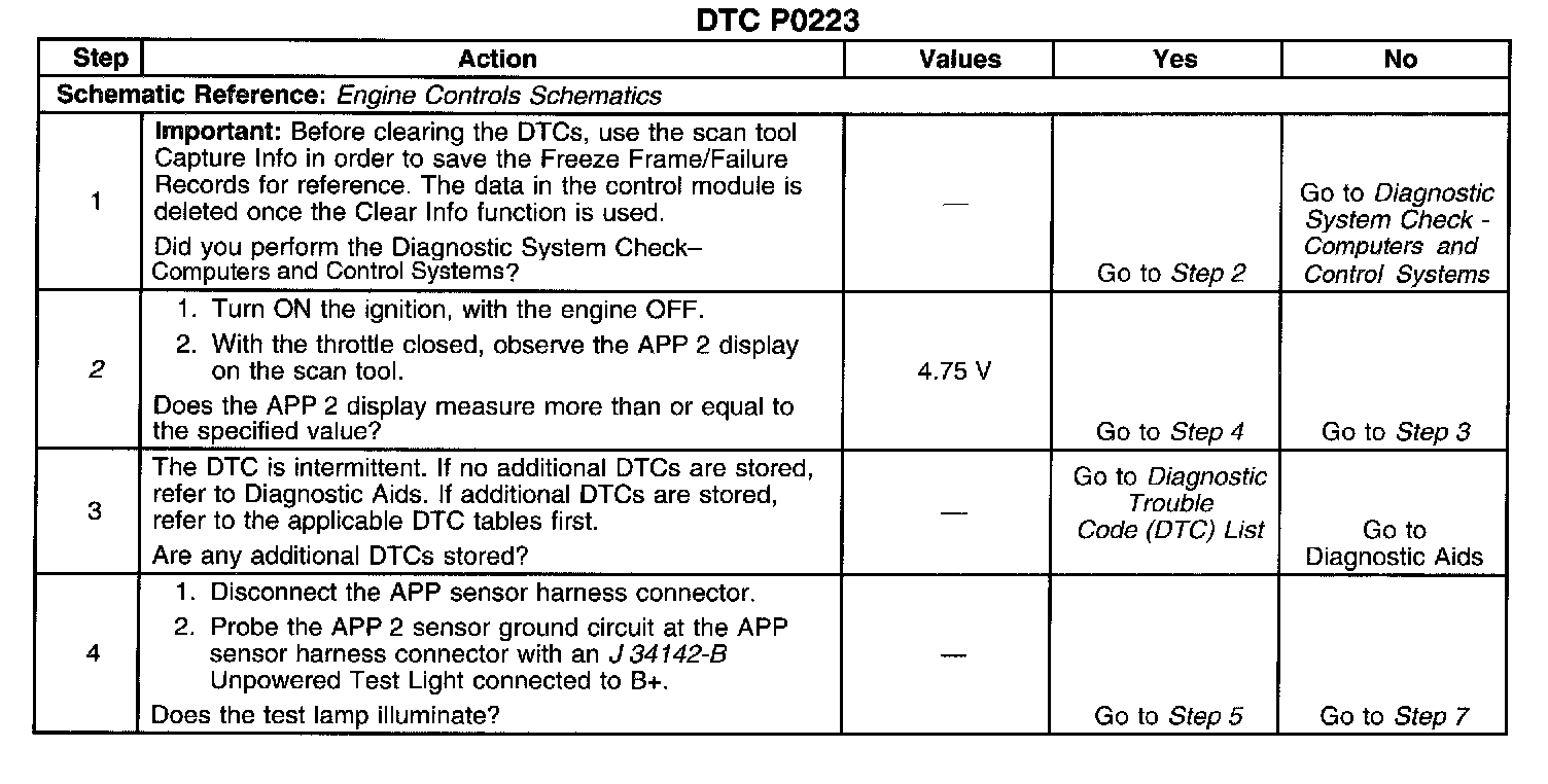 A scan tool reads the APP 2 position in volts and should read approximately 4.5 volts with the throttle closed and with the ignition ON or at idle. The voltage should decrease at a steady rate as the throttle is moved toward wide open throttle (WOT). Also, 90 percent pedal travel is acceptable for a correct APP operation. Scan the APP 2 signal while depressing the accelerator pedal with the engine stopped and the ignition ON. The display should vary from approximately 4.5 volts when the throttle is closed to approximately 1.5 volts when the throttle is held at the WOT position. A DTC P1125 may possibly set along with DTC P0223 if the signal circuit is open.