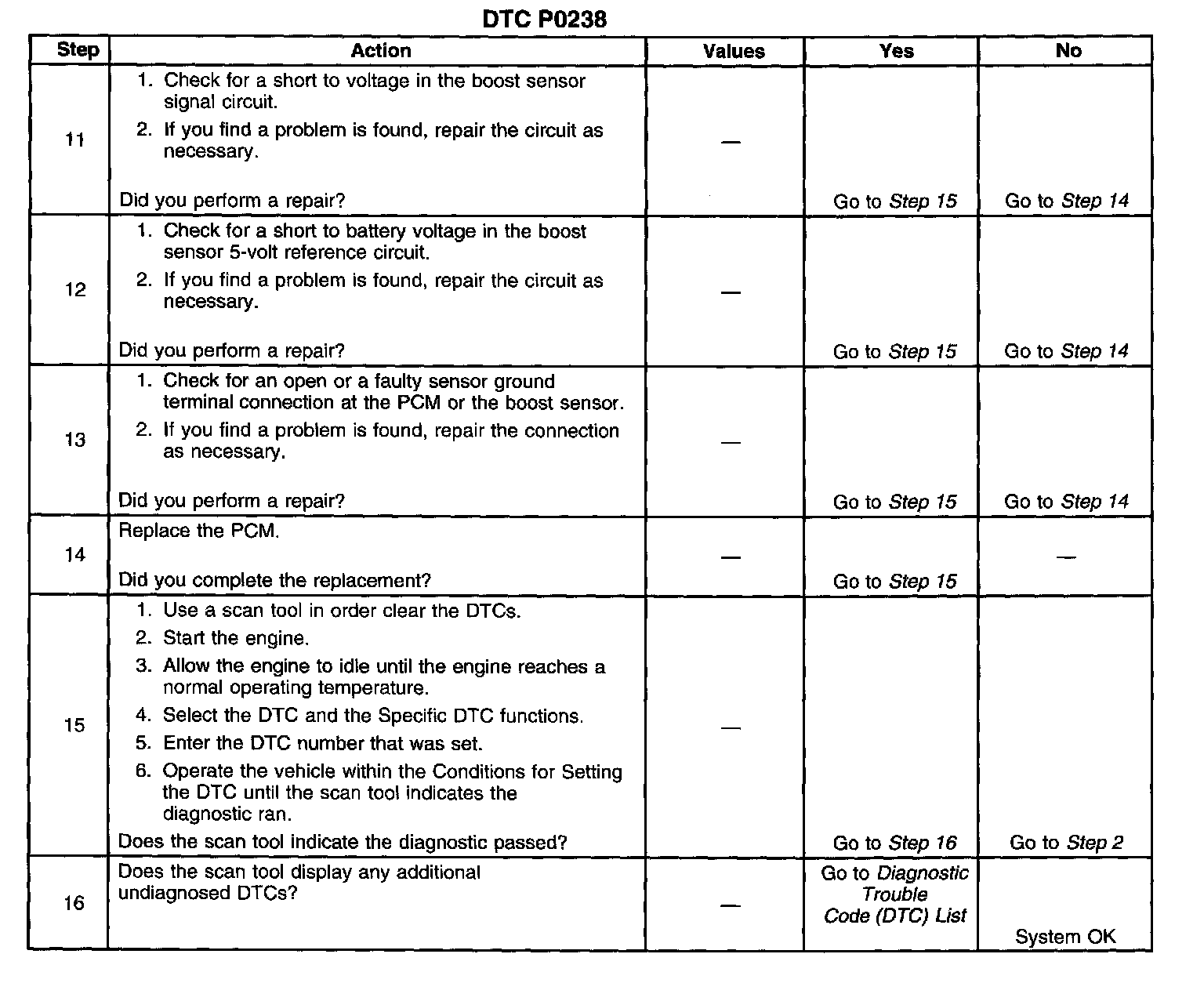 The numbers below refer to the step numbers on the diagnostic table.