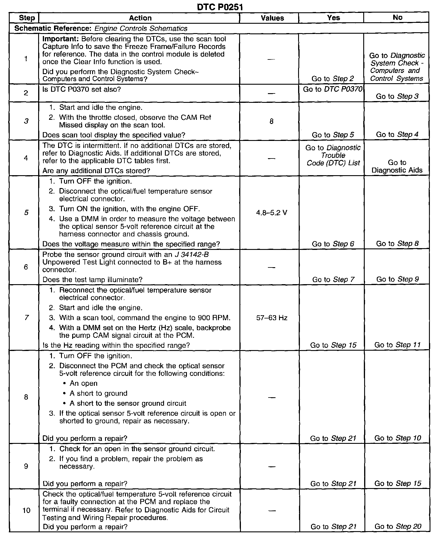 CIRCUIT DESCRIPTIONThe optical sensor provides a pump cam signal to the powertrain control module (PCM) by counting the pulses from the sensor that monitors slots on the data track disk that is located inside the injection pump. The pump cam is one of the most important PCM inputs for fuel control and timing. This test monitors the number of crankshaft position pulses that have occurred since the last cam pulse. The physical one-to-one correspondence between the pump cam and the crankshaft implies that if more crank pulses than cam pulses are detected, the cam pulses have been missed.