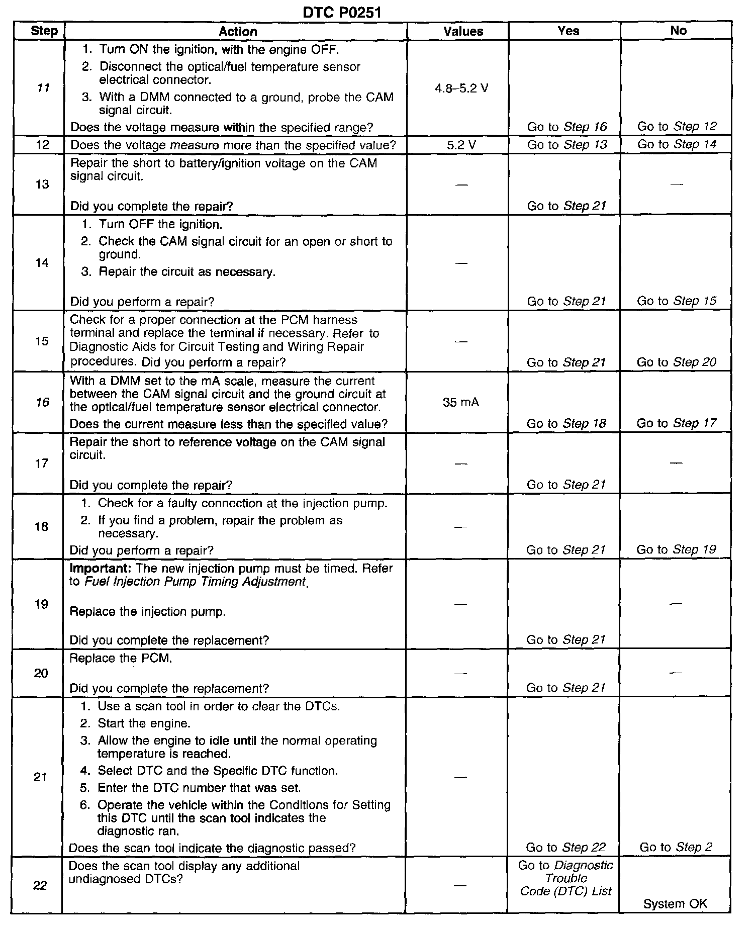 16. This step determines if the signal circuit is shorted to 5 volt. A normal CAM signal circuit will have 3-5 mA. Any reading over 35 mA indicates a short to 5 volt.