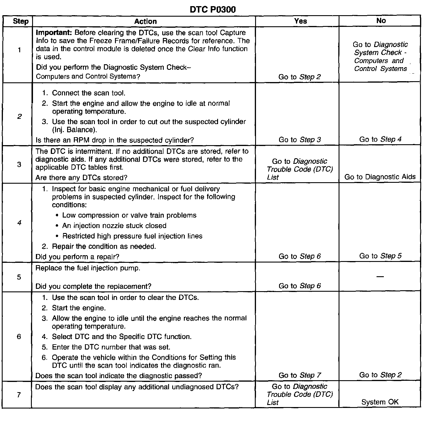 The numbers below refer to the step numbers on the diagnostic table.