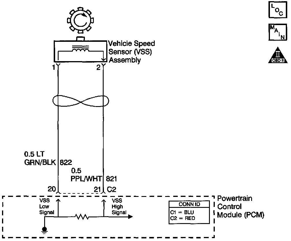 The Vehicle Speed Sensor (VSS) assembly provides vehicle speed information to the Powertrain Control Module (PCM). The VSS assembly is a Permanent Magnet (PM) generator. The VSS produces an AC voltage as rotor teeth on the output shaft of the transmission pass through the sensor's magnetic field. The AC voltage level and the number of pulses increase as the speed of the vehicle increases. The PCM converts the AC voltage to vehicle speed. The PCM uses the vehicle speed signal to determine shift timing and Torque Converter Clutch (TCC) scheduling.