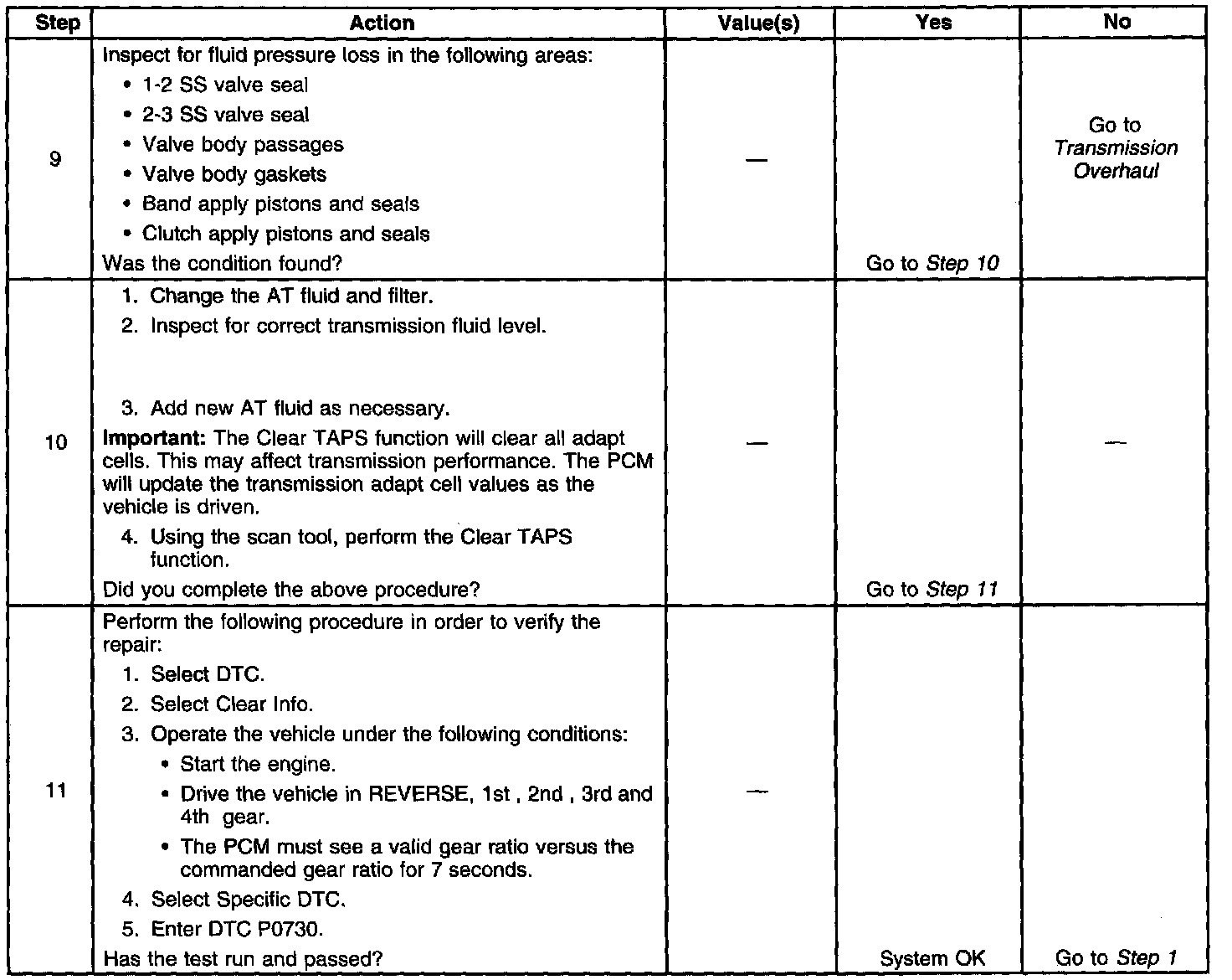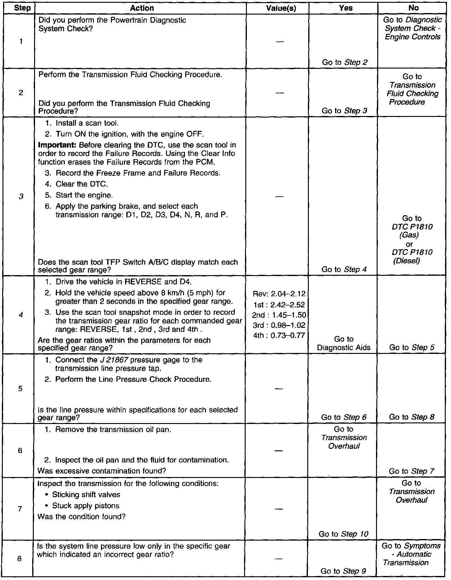 3. This step tests the indicated range signal to the actual selected range. A faulty TFP manual valve position switch could set DTC P0730.