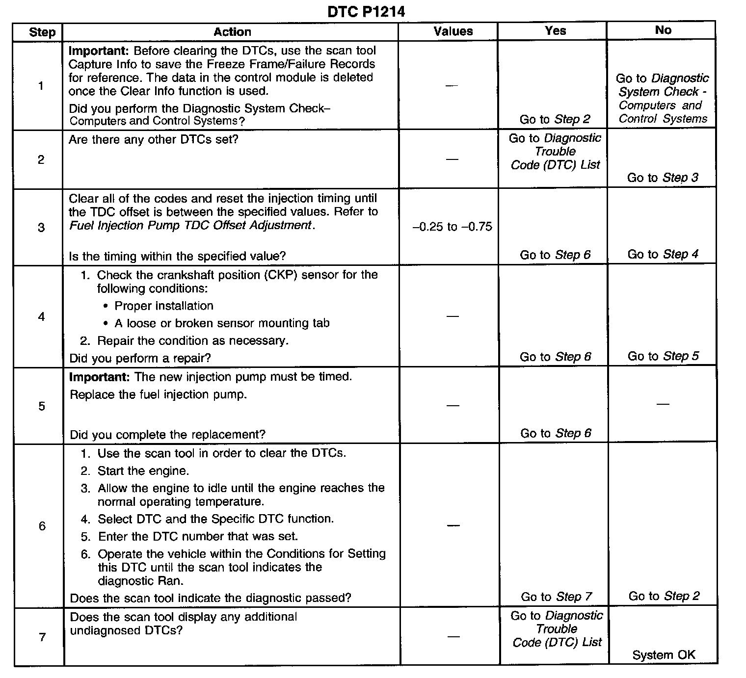 The PCM will only run the diagnostic test if the TDC offset adjustment time set procedure has been activated. The vehicle will most likely not be brought in with this DTC set. Refer to Fuel Injection Pump TDC Offset Adjustment