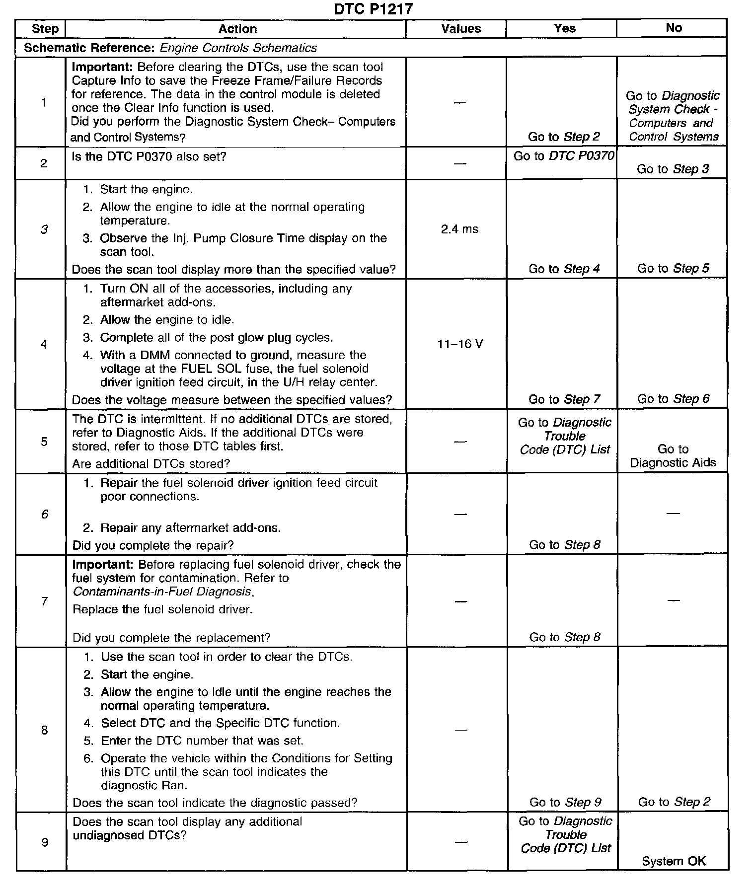 A weak (mechanical failure) fuel solenoid will result in a DTC P1217. If DTC P1217 is set with any other DTCs, diagnose them first. If the vehicle is running close to the DTC setting closure time, the vehicle should be checked during cold start ups and during hot conditions.